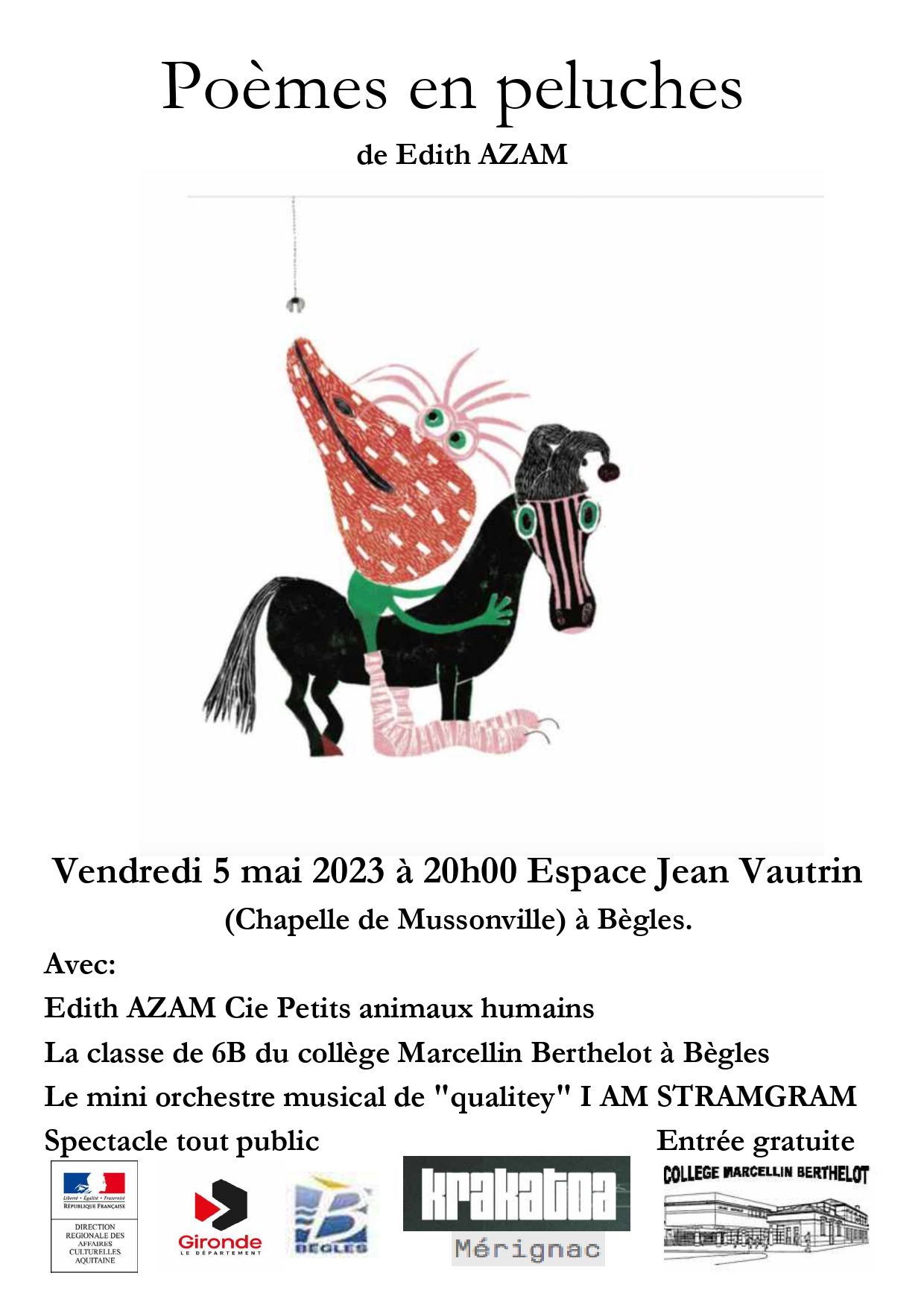 Accompagnés de Edith Azam, poétesse contemporaine, ils ont été invités lors d’une de ses représentations théâtrales intitulée « Poèmes en peluches ». Les élèves ont également effectué une représentation au Théâtre en Miettes de Bègles afin de faire rayonner leur projet.