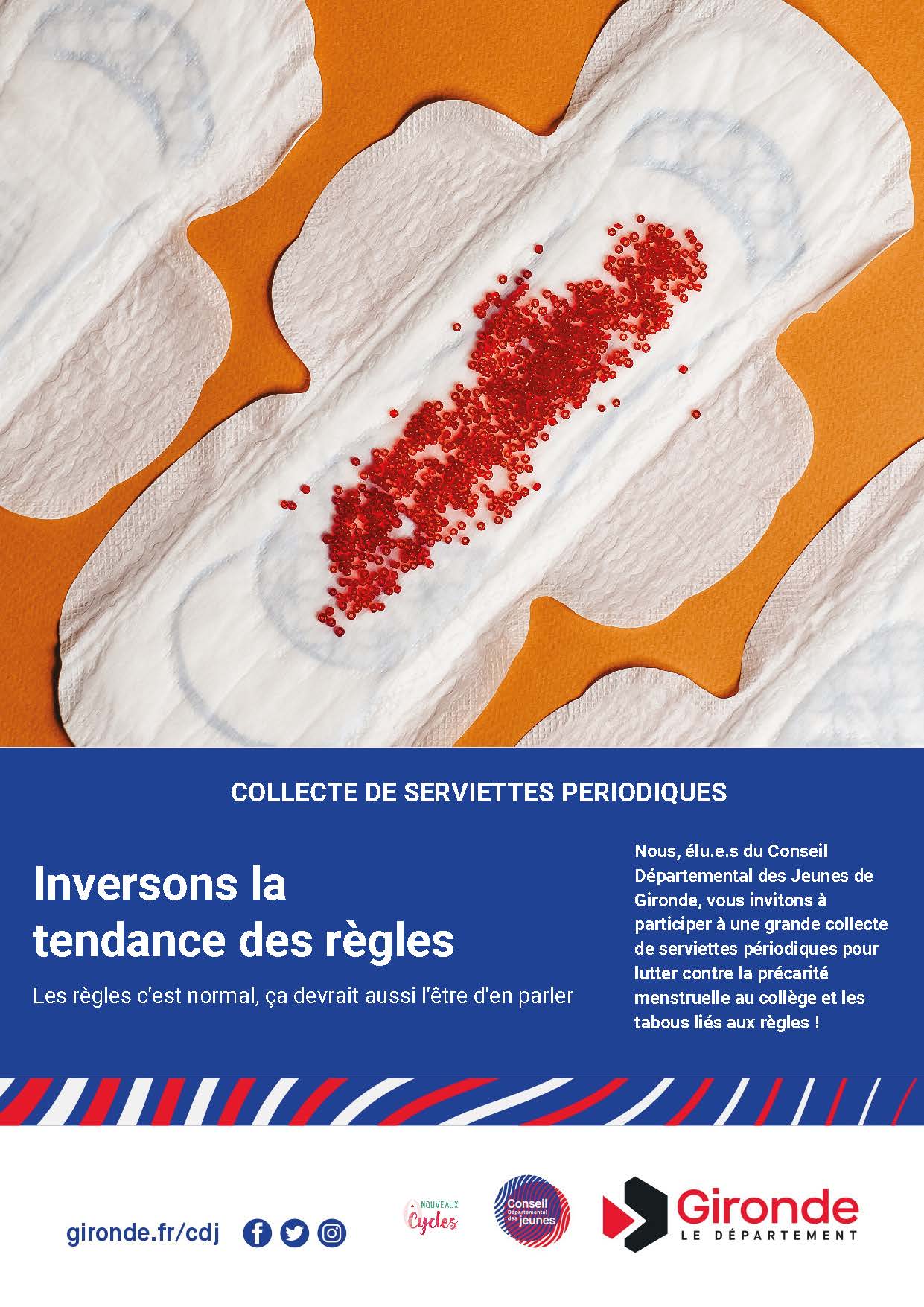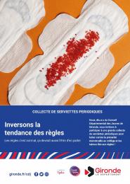 Les jeunes élus ont souhaité rendre possible l’organisation d’une collecte de protections périodiques dans leurs établissements. En collaboration avec l’association Nouveaux Cycles, ils ont créé un flyer d’appel aux dons de protections périodiques qui pourra être distribué dans leur collège à la rentrée 2022. Cette démarche solidaire vise à sensibiliser le plus grand nombre dans les collèges.