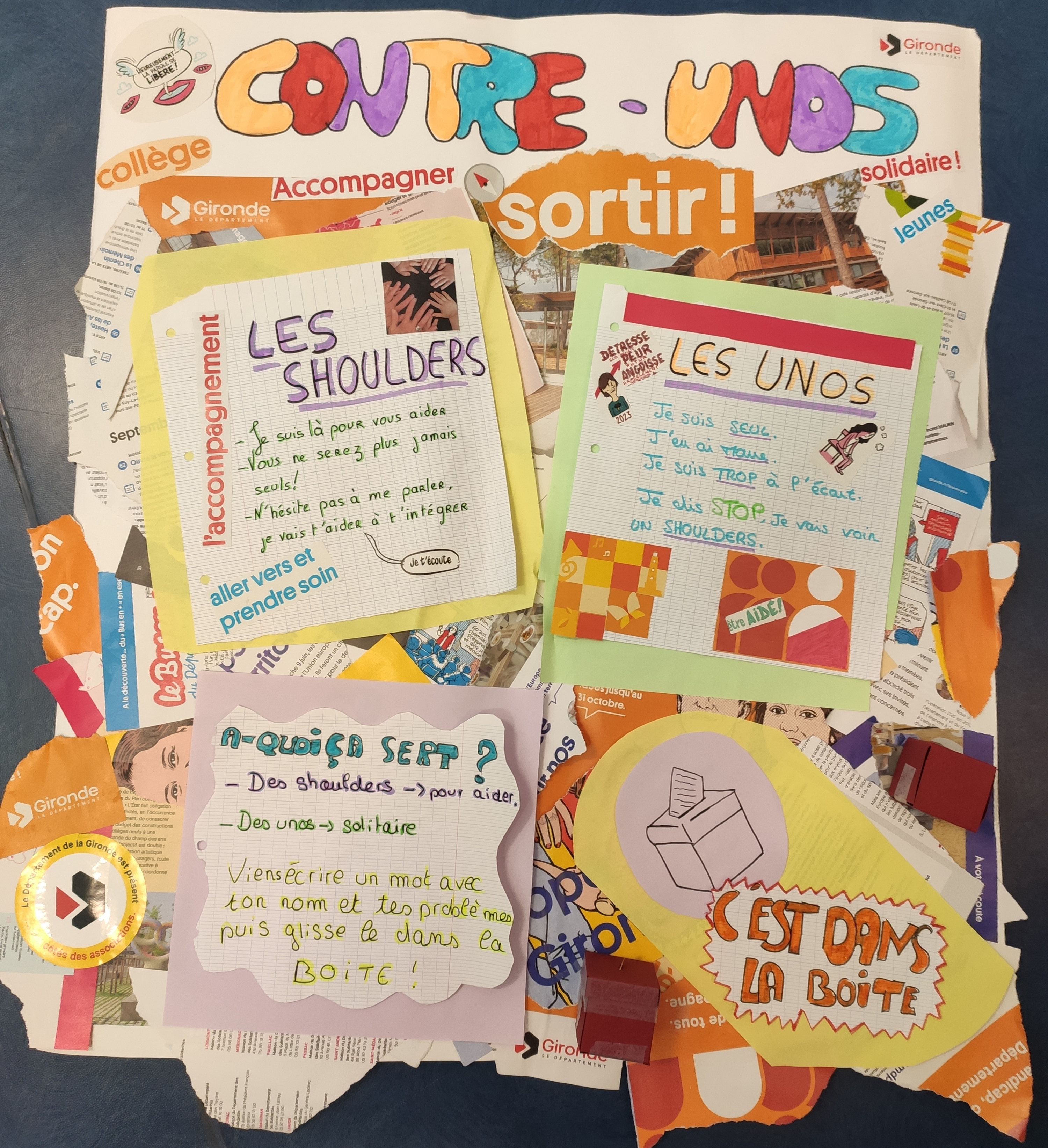 L’objectif ? Mettre en relation des jeunes en situation d’isolement dans les collèges (les Unos), au travers d’une petite urne, avec des élèves volontaires pour les accompagner et créer du lien social (les Shoulders ou épaule en anglais). Avec le soutien d'adultes référents, les Shoulders échangeront avec les Unos qui se seront signalés via une boîte dédiée.