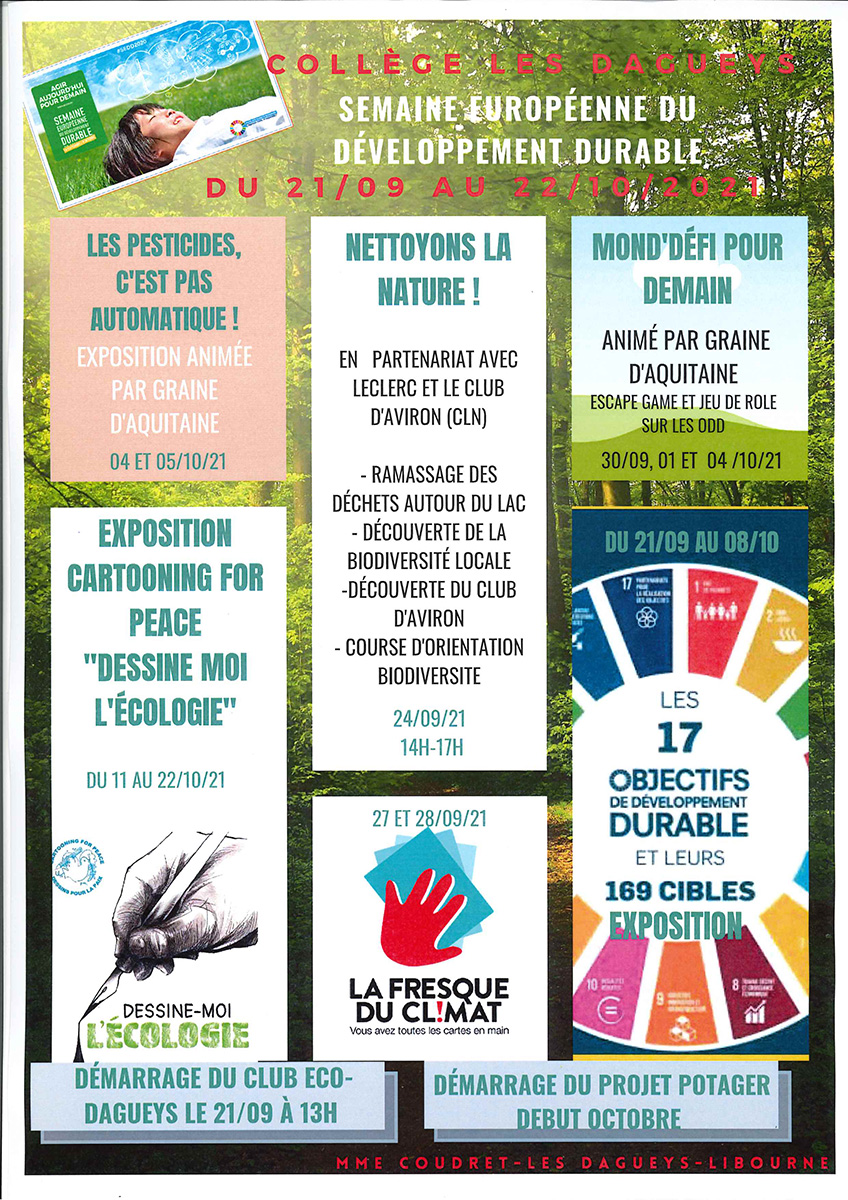 Retour sur le projet mené au sein du collège Les Dagueys, en septembre et octobre 2021, à l'occasion de la semaine européenne du Développement Durable. Objectifs : promouvoir le développement durable, sensibiliser à ses enjeux et encourager une mobilisation concrète, individuelle et collective.