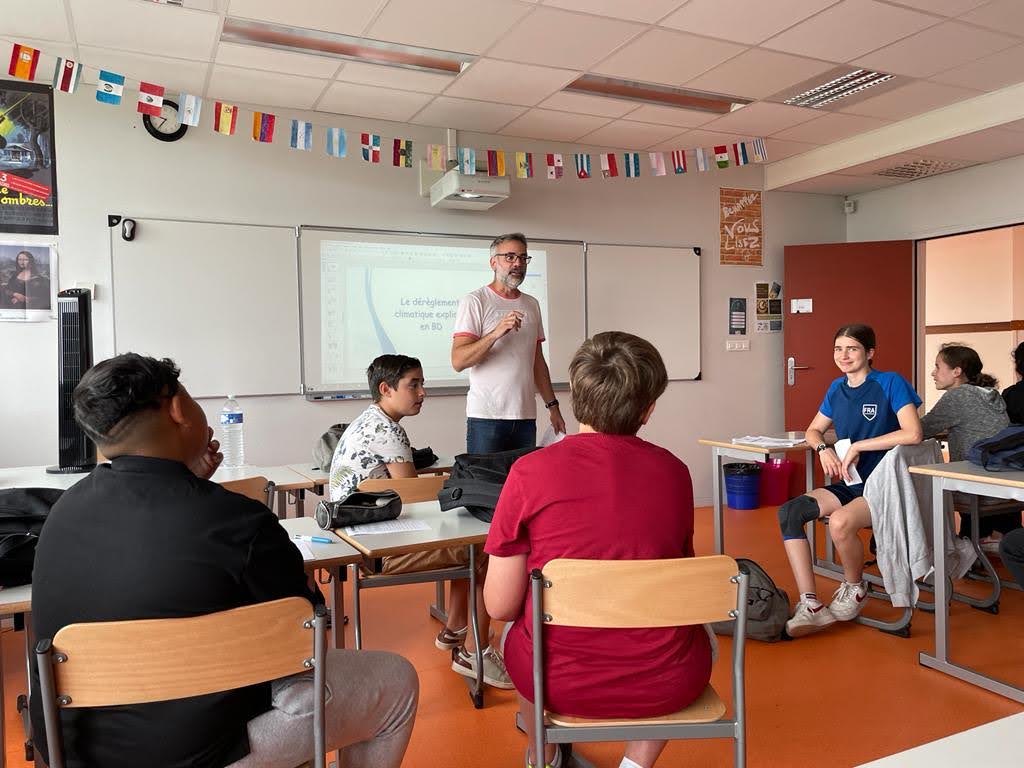 Découvrez comment une classe de 4e du collège Claude Masse d'Ambarès a réalisé une BD pour illustrer les changements climatiques en compagnie de l'auteur Bast. Rencontre.