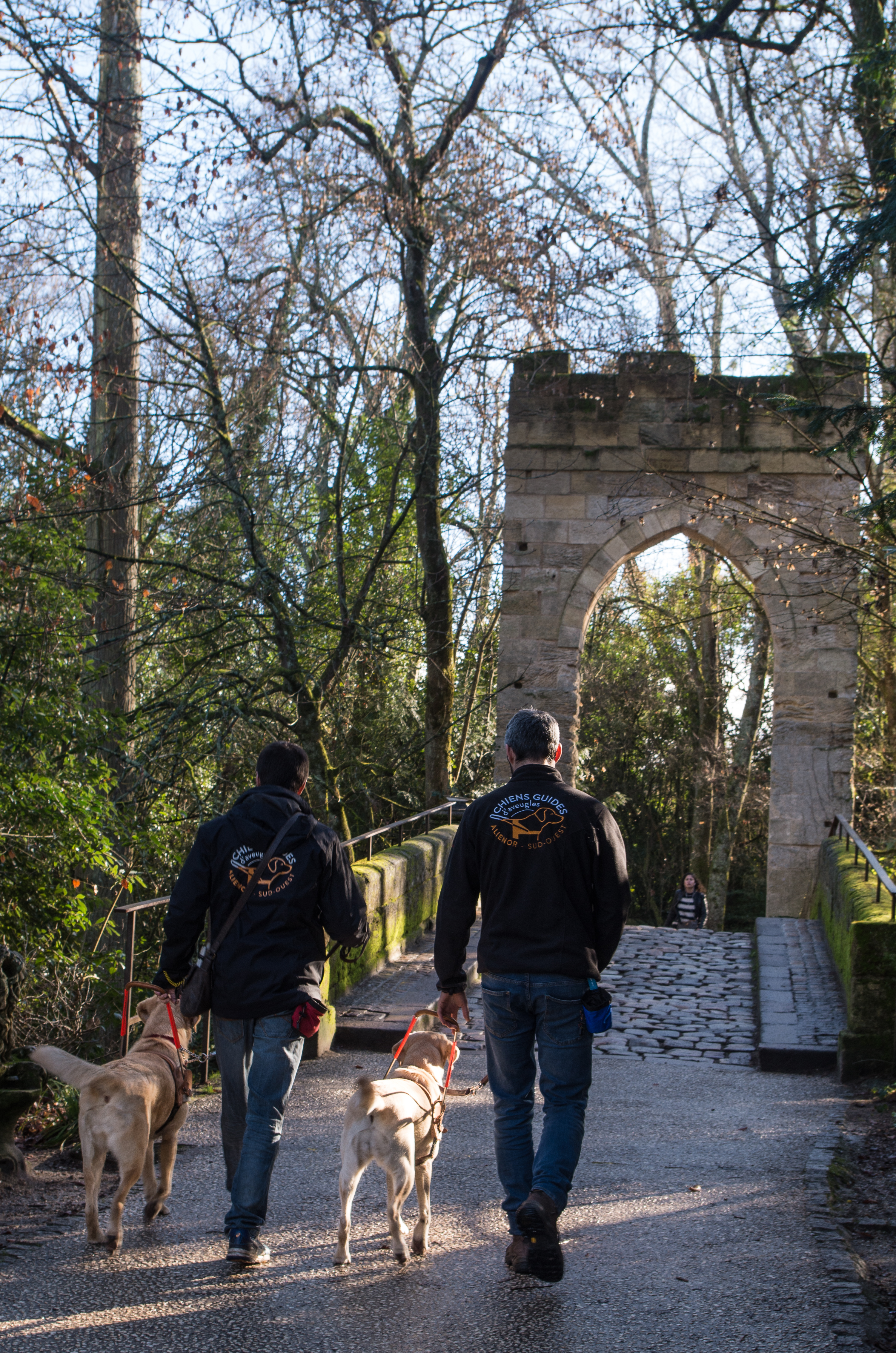 Cet après-midi là, Benjamin, Rémi et Geoffrey se préparent pour l’entraînement. Ils ont choisi d'emmener leurs chiens au parc du Bourran à Mérignac. « Il y a beaucoup d'animaux ce sera un exercice de concentration pour eux ». Première étape enfiler le harnais. « A partir de là, ils savent qu'ils sont au travail, et n'ont pas le droit d'aller renifler les autres chiens ou de courir après les animaux ou un ballon par exemple ». ça tombe bien, il y a tout ça sur le trajet de Benjamin Valembois et Mara, un labradoodle qui en est déjà à la deuxième étape de sa formation. La femelle frisottée s'assoit en haut des escaliers ou devant les obstacles comme les bosses ou les flaques d'eau pour les signaler. Elle connaît sa droite et sa gauche et reste presque impassible devant les canards et les oies.