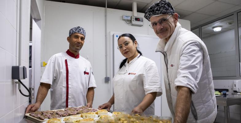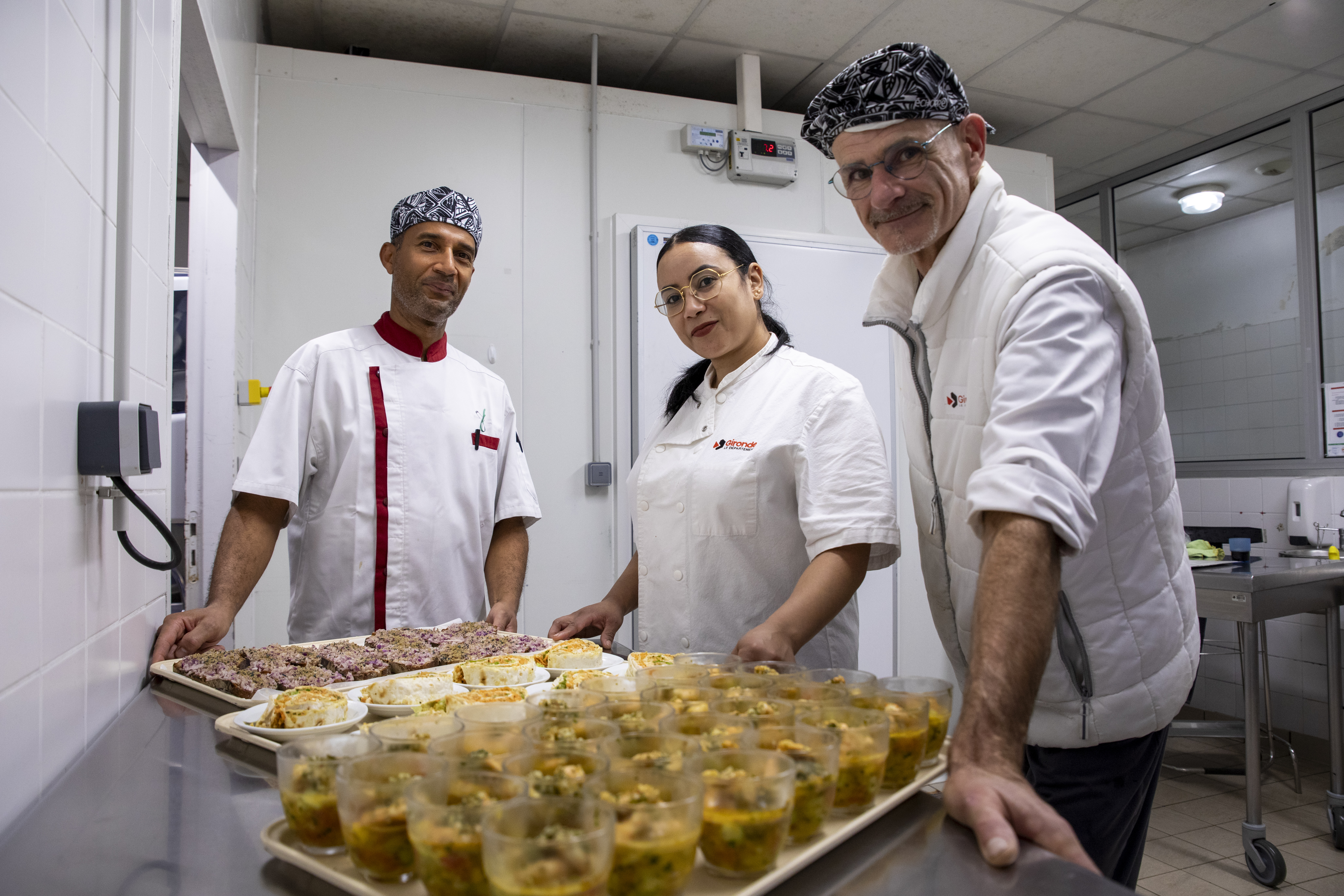 Pierre s’enthousiasme : depuis son arrivée, la proportion de menus bio dans le collège est passée de 4.6% à 82%. Il souligne également que 95% des produits utilisés répondent à la loi Egalim, en faveur d’une alimentation plus durable, saine et accessible. Dans cette aventure, Pierre est aidé entre autres par son second Jérémy Vodougbe, qui propose des yaourts issus de producteurs locaux. Houda Benbdad, elle, est responsable des entrées froides, et met en avant des verrines diverses, des wraps à l’houmous et quelques spécialités orientales.