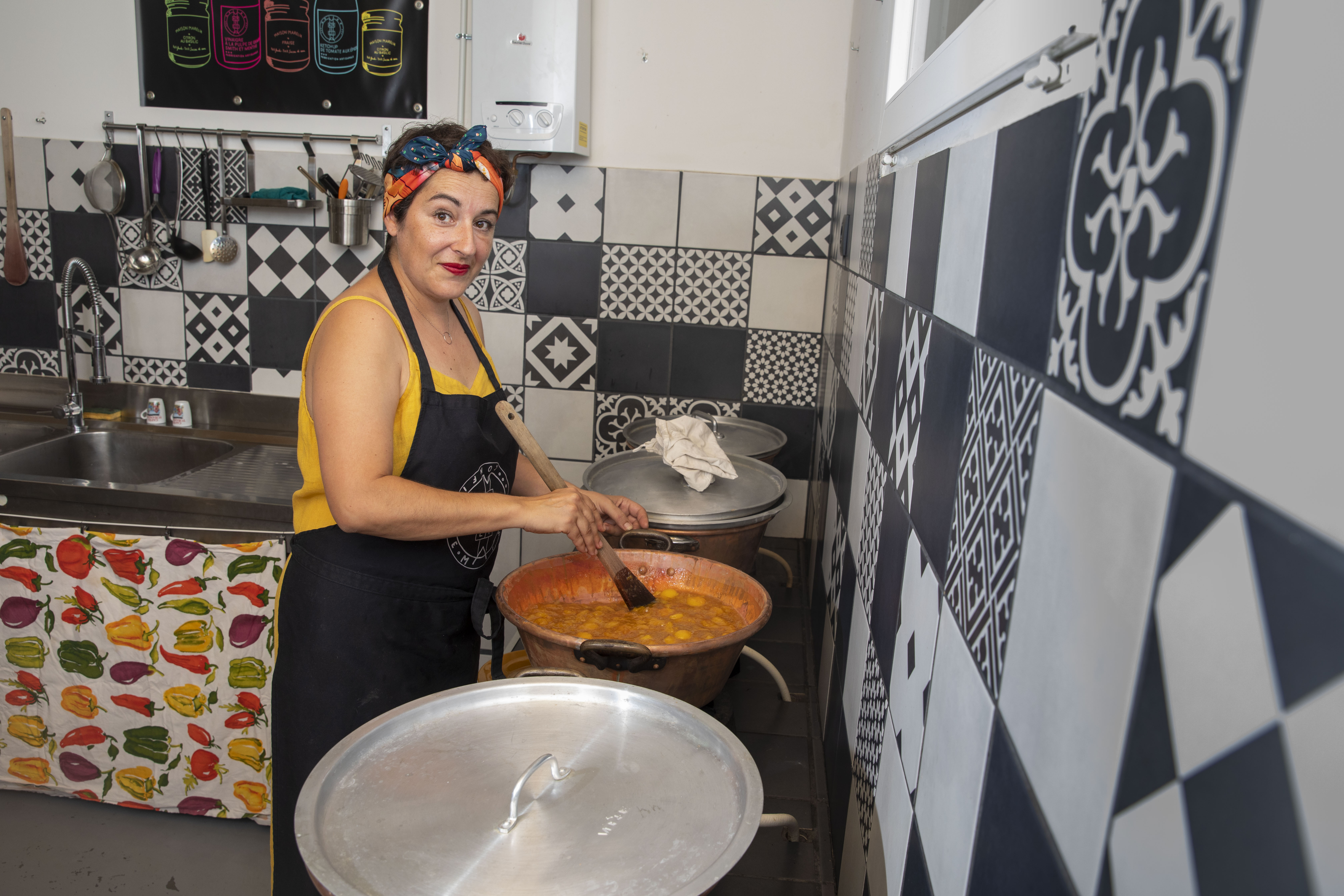 Dans ses chaudrons de cuivre, singularité et équilibre se rencontrent là où la figue s’allie à l’abricot, aux épices et aux pistaches, ici où la pêche de vigne se parfume de lavande, là encore quand la fraise vient s’aromatiser à la vodka Pyla. Confits de vins et vinaigres surprenants complètent son activité.