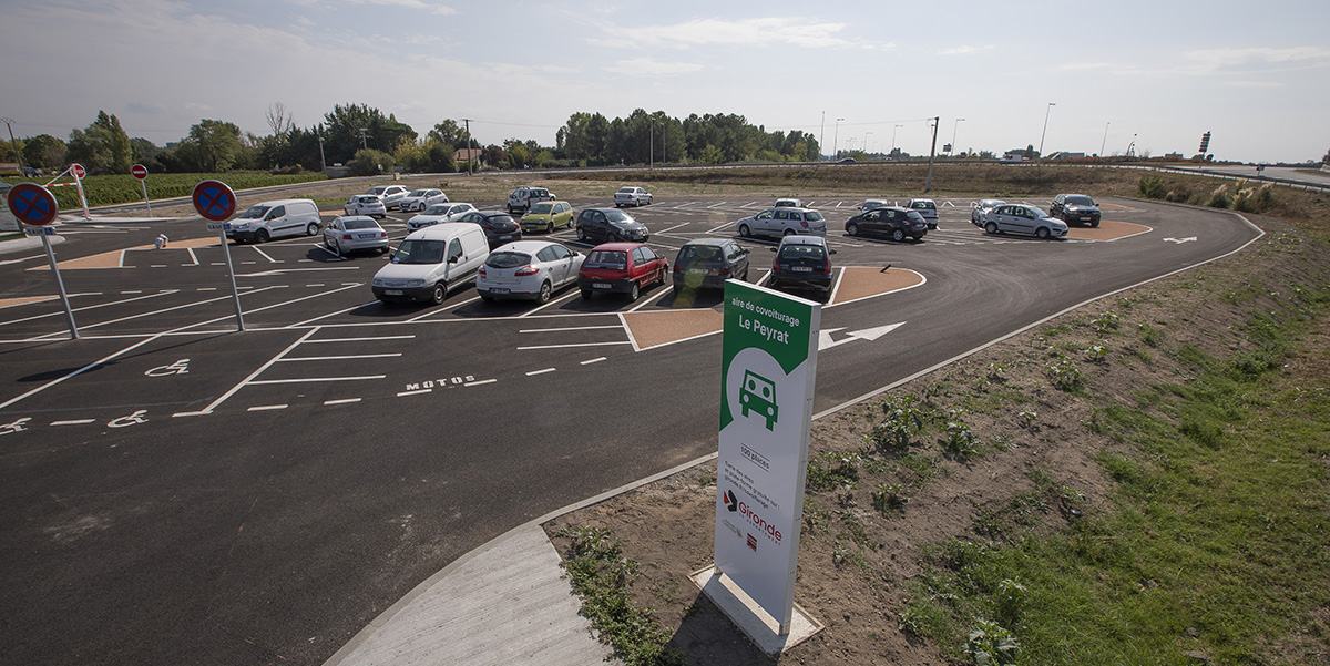Le Département encourage les mobilités durables du quotidien (vélo, marche à pied...) et le partage des véhicules ou covoiturage, pour fluidifier le trafic et réduire l’impact environnemental des déplacements. 135 aires sont en service sur le territoire girondin offrant au total 2 804 places de stationnement.
