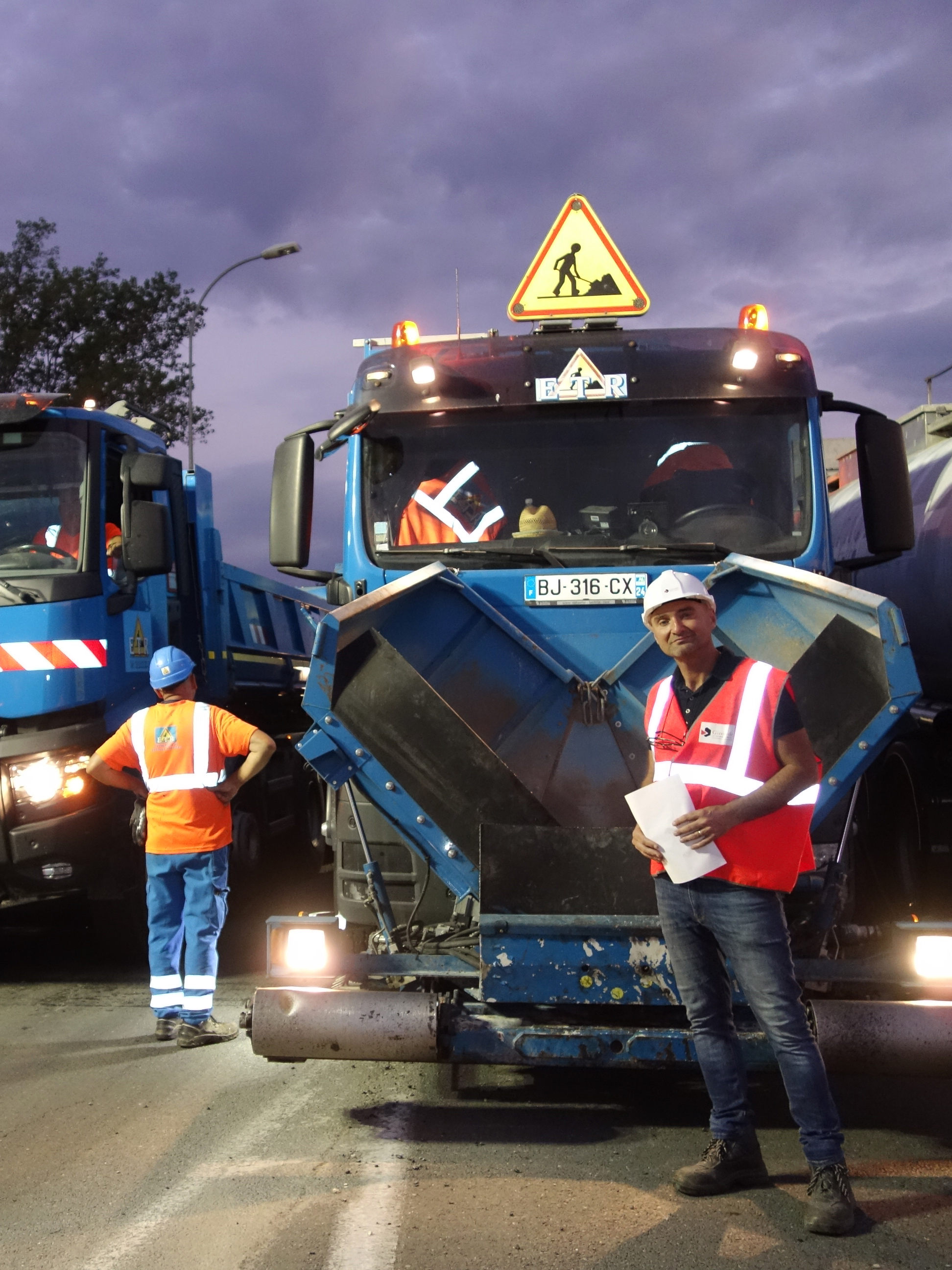 Son intervention du jour consiste en la réfection de la couche de roulement sur le contournement de Sainte-Foy-La-Grande et Pineuilh, axe de grande circulation. Il voit passer environ 7 000 véhicules par jour, dont 7 % de camions. Un travail effectué de nuit, entre 22 heures et 6 heures, pour ne pas gêner le trafic.