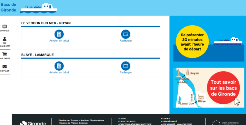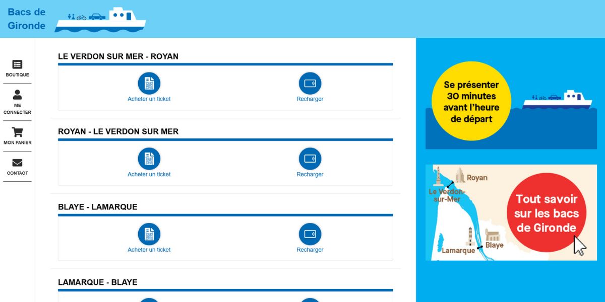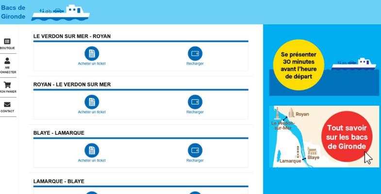 Les passagers peuvent désormais acheter leurs billets directement en ligne pour l’ensemble des traversées (piétons adultes, enfants, mais aussi véhicules de toutes sortes : vélos, motos, quads, voitures, fourgons, remorques, caravanes, camping-cars…). Il est également possible de recharger facilement une carte de 10 passages depuis son compte en ligne.