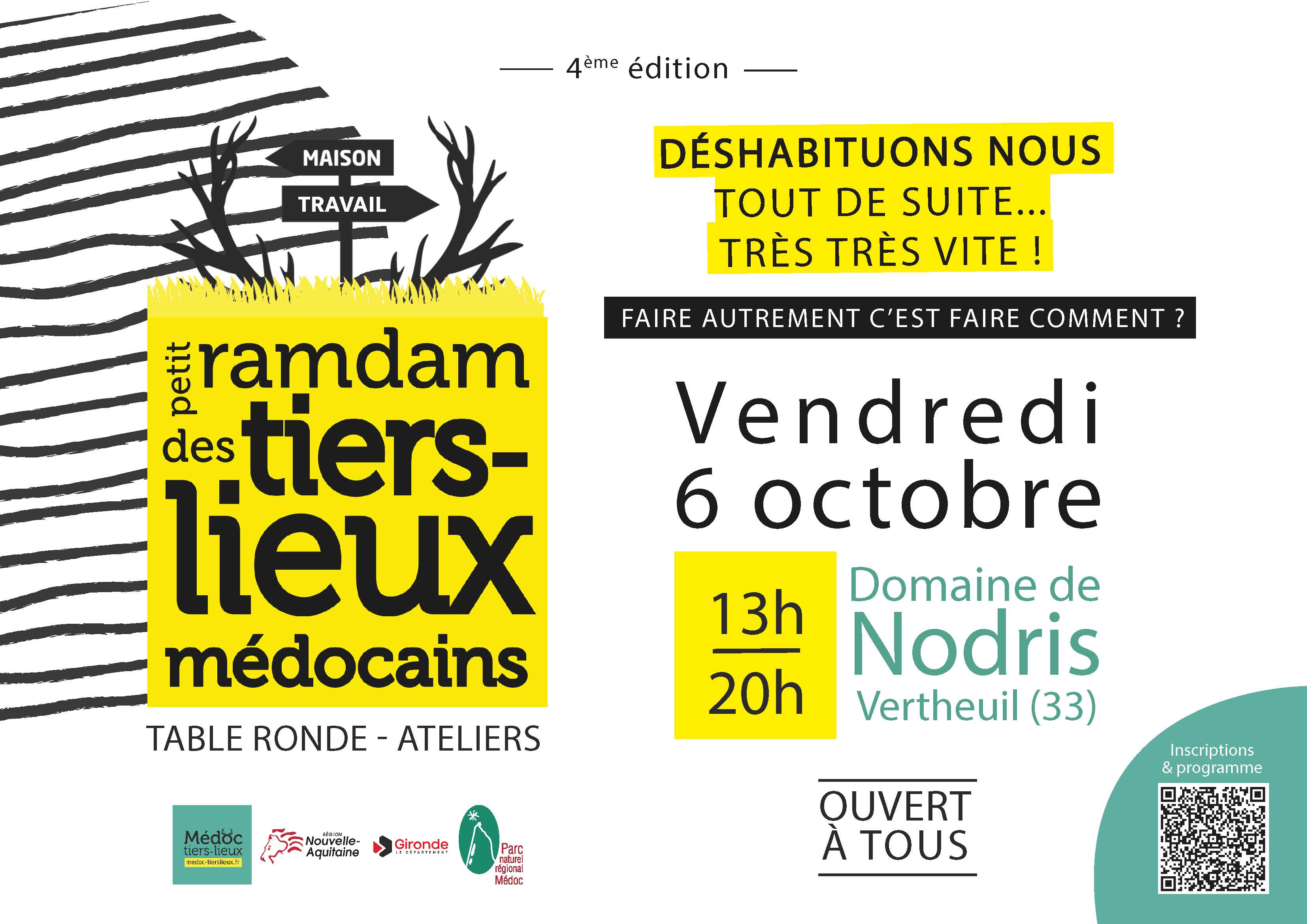 Pour la 4e édition de leur rendez-vous bisannuel, le Réseau des tiers-lieux du Médoc et le Parc naturel régional Médoc invitent, le vendredi 6 octobre au Domaine de Nodris, dès 13h, à une réflexion collective à partir d’expériences déjà conduites, sur la manière de faire autrement, avec des acteurs locaux pour faciliter les transitions écologiques, économiques et sociales en Médoc.