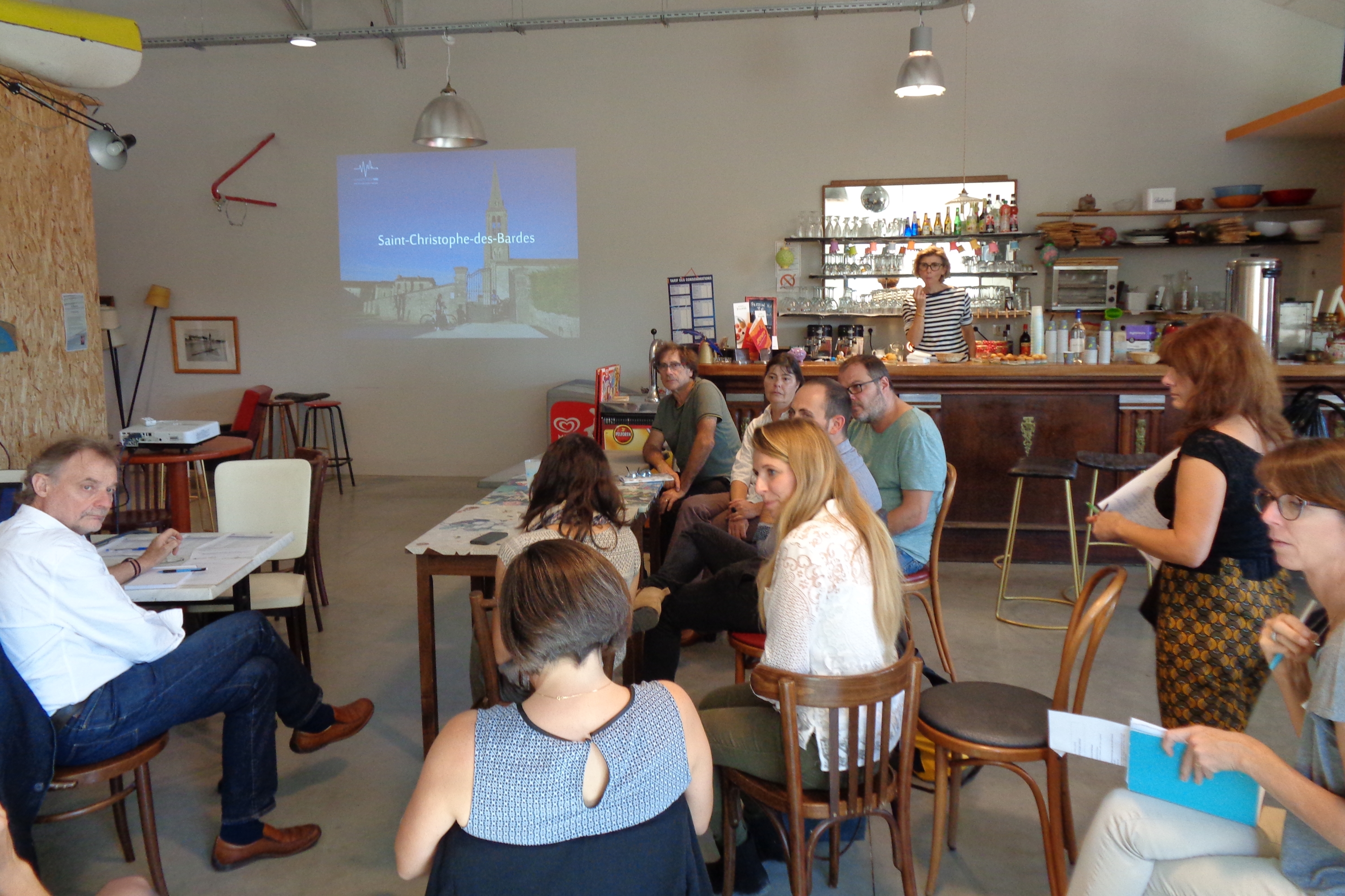 En matinée ont eu lieu des temps d'échanges sur les méthodes et accompagnements possibles en matière de projets de centres-bourgs, avec des professionnels en urbanisme et sociologie, et le témoignage de 2 maires ruraux (La Sauve en Gironde et Parcoul Chenaud en Dordogne), investis chacun à revitaliser le centre-bourg de leur commune.