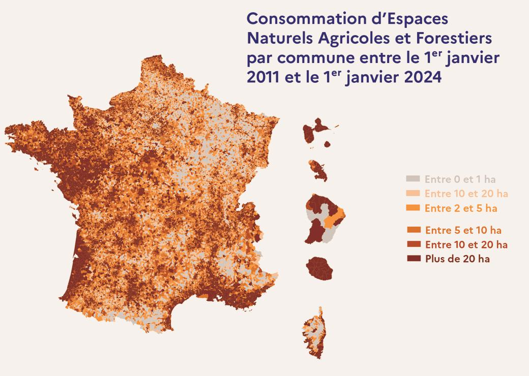 La consommation des espaces Naturels Agricoles et Forestiers par commun (2011-2024)