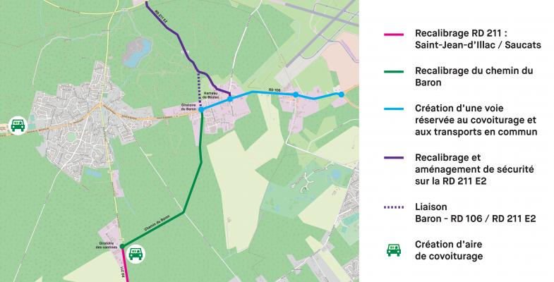 - Ces aménagements s’inscrivent dans le prolongement du renforcement de la RD 211 entre Saucats et Saint-Jean-d’Illac déjà déclaré d’utilité publique.