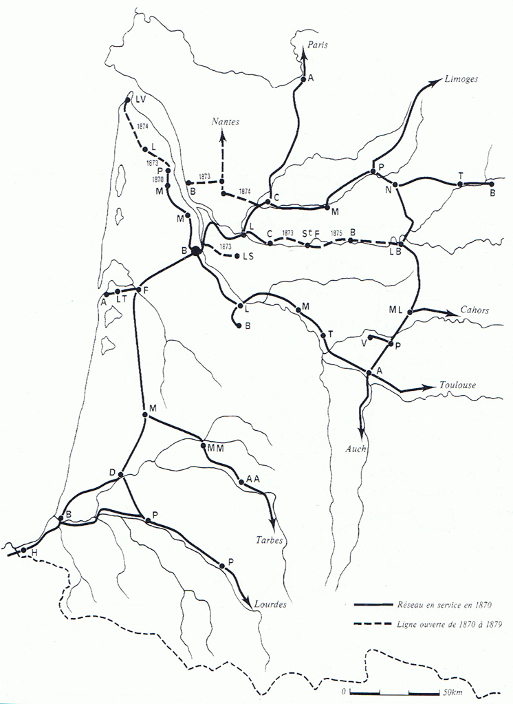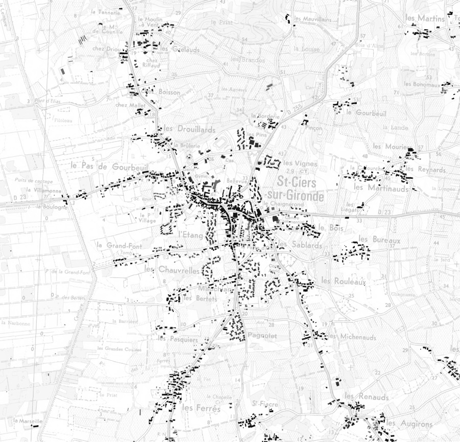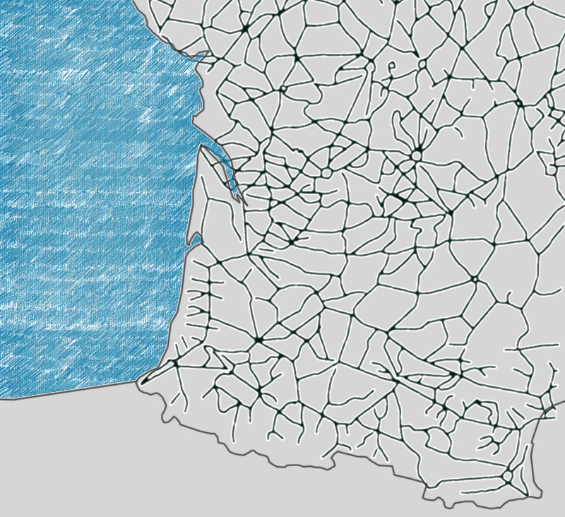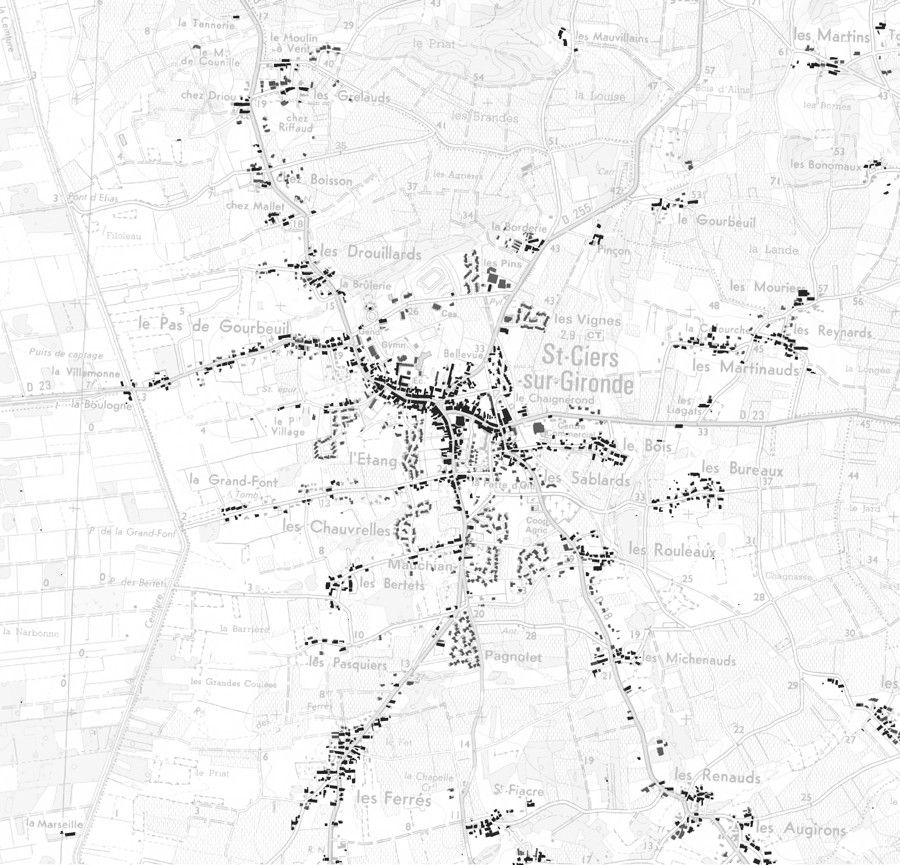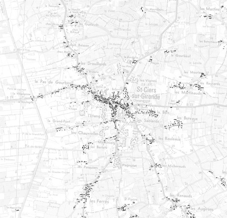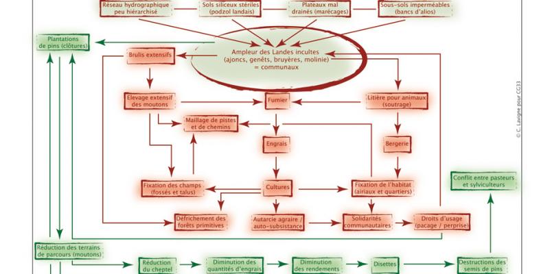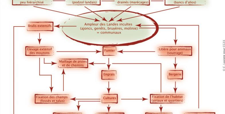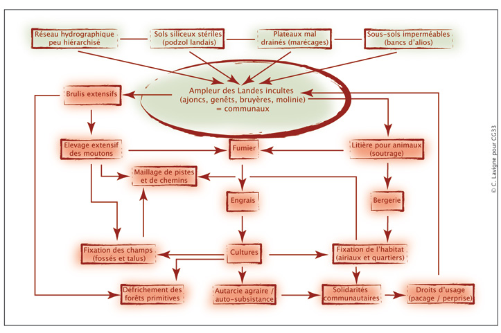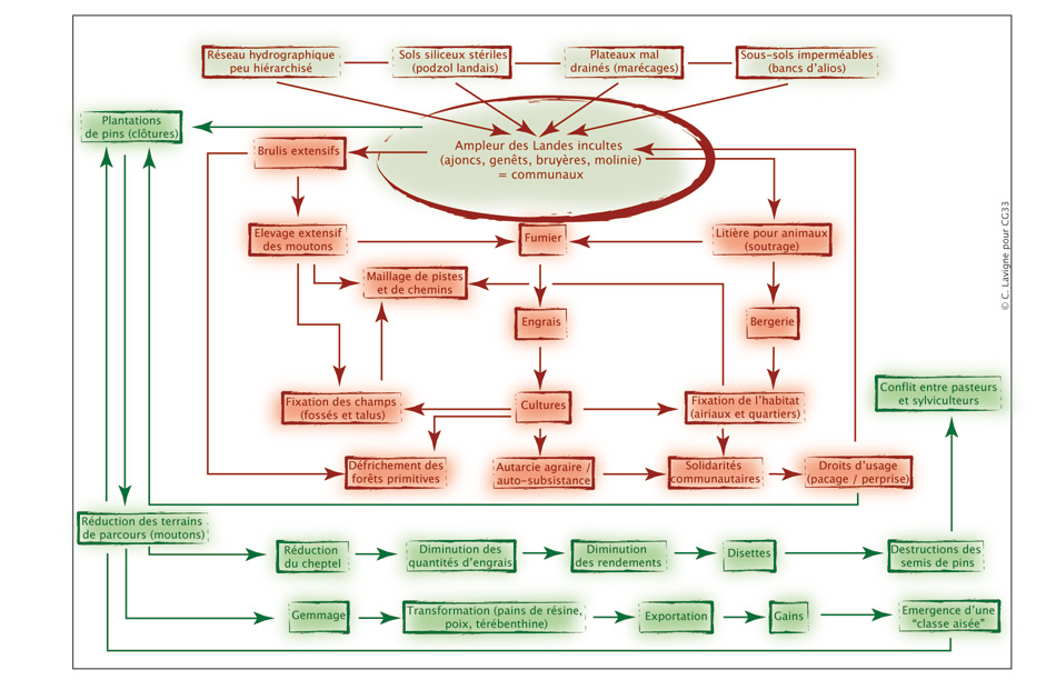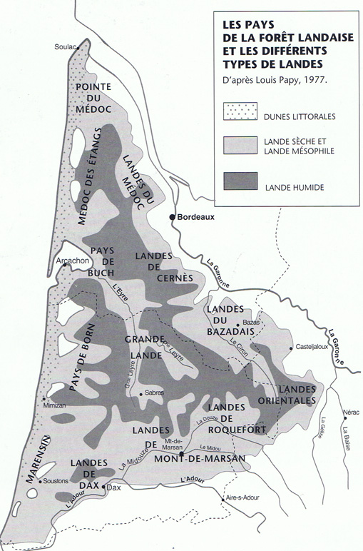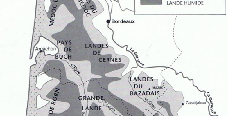 Cette équation a fondé le fragile équilibre du régime agro-pastoral des sociétés médiévales et modernes de la Lande. Il rend compte des formes d’organisation de lécoumène telles que nous permettent de les appréhender au XVIIIe siècle les cartes de Masse, de Belleyme et de Cassini : des îlots de peuplement et d’occupation, reliés entre eux par des réseaux de chemins et de voies de grand parcours, entourés d’immenses étendues de landes et de marécages.