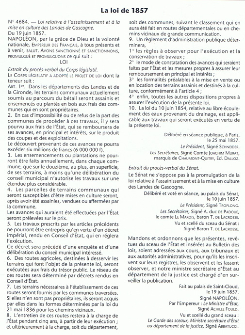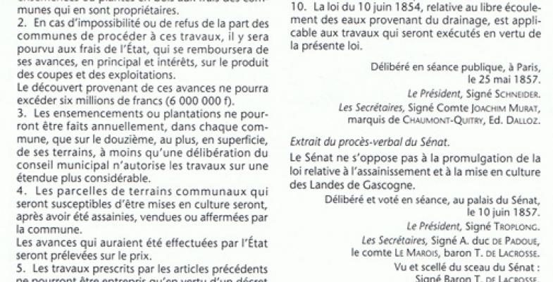 Vers 1850, Jules Chambrelent, Ingénieur des Ponts et Chaussées, est chargé de l’assèchement et de la mise en culture des 700 000 hectares du plateau landais. L’ultime obstacle restait alors d’arracher aux communautés villageoises les landes dont elles avaient besoin pour leur bétail et qu’elles possédaient à titre personnel ou collectif depuis des temps immémoriaux. Sous l’impulsion de Napoléon III, est alors votée, le 19 juin 1857, une loi qui oblige les communes à assainir et à ensemencer leurs vacants.