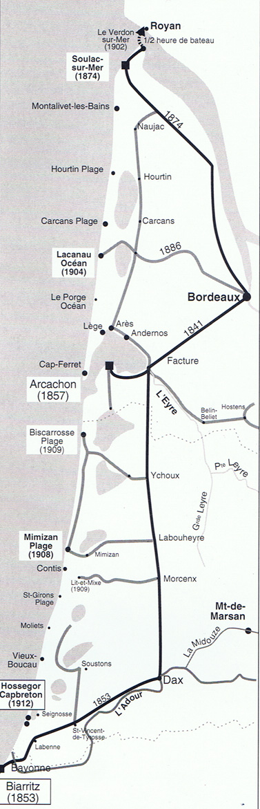 Un processus similaire est à l’origine du développement de la station balnéaire de Soulac-sur-Mer, en Médoc, où Antoine Trouche aménage, à partir de 1849, un lotissement en bord de mer qui constituera le noyau à partir duquel se développera la ville à partir de 1874, date de l’arrivée du chemin de fer.