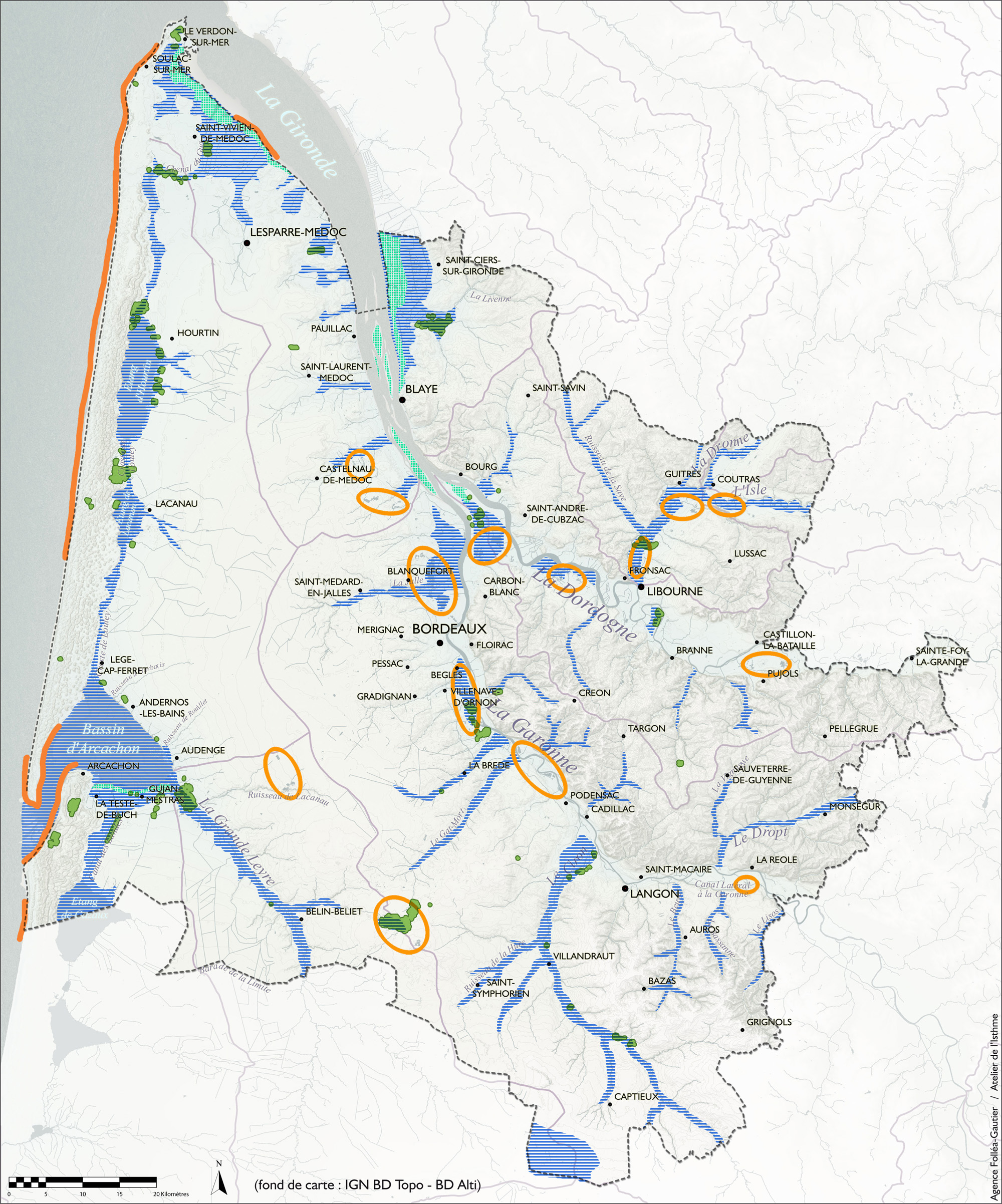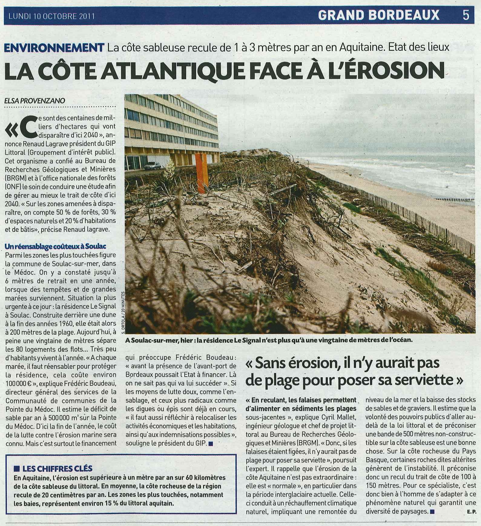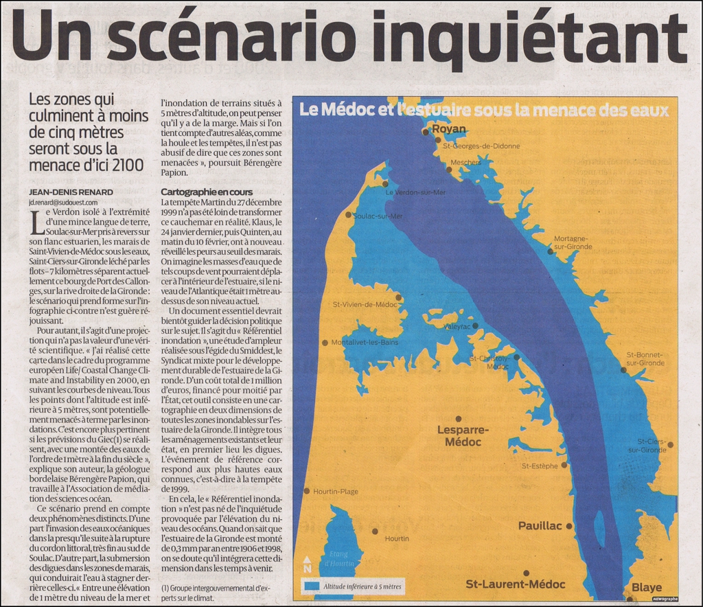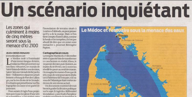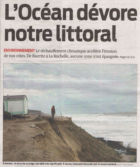La tempête Xynthia, à la fin du mois de février 2010, a permis d’identifier les sites exposés, soit l’aval de l’estuaire de la Gironde, les côtes basses sableuses ou marécageuses (dunes érodées du littoral, mattes et marais de l’estuaire) et le Bassin d’Arcachon, les zones les plus exposées étant évidemment celles les plus fortement urbanisées. Pour éclairer les choix politiques qui devront nécessairement être faits, l’Etat, la Région Aquitaine et les Départements de la Gironde, des Landes et des Pyrénées-Atlantiques se sont dotés de plusieurs outils d’évaluation, tels l’Observatoire de la Côte Aquitaine ou le GIP-Littoral. Les options sont connues (protections dures par enrochements, digues et épis ; protections douces par restauration des milieux humides ; retrait en arrière du front de mer) ; reste le plus difficile, décider et agir…