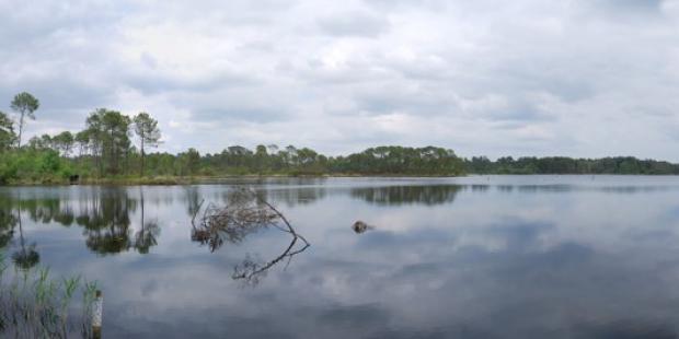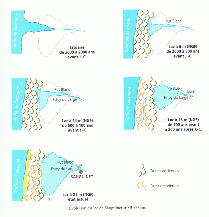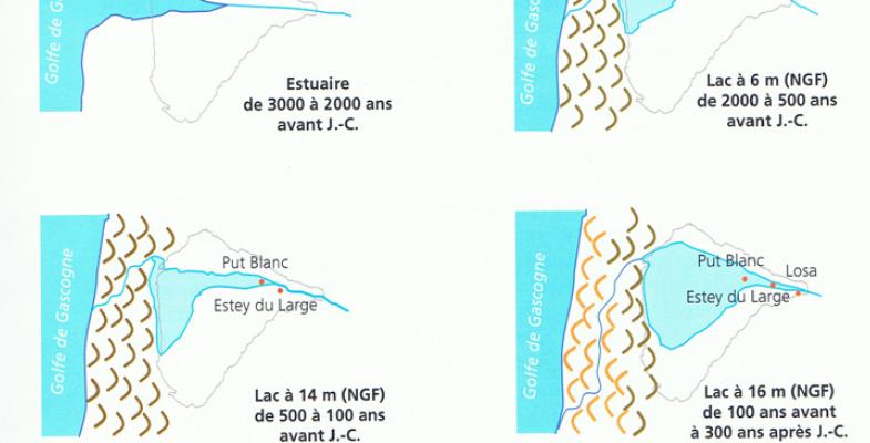 Ces dunes, en faisant obstacle à l’écoulement des rivières qui drainaient le plateau landais (appelés localement des courants), vont rapidement provoquer des accumulations d’eau douce en arrière du massif dunaire dont le niveau ne cessera de s’élever avec le temps, conduisant à la formation de la chaîne des lacs rétro littoraux actuels de la côte Aquitaine. L’histoire des populations de la zone littorale girondine est, depuis l’époque préhistorique, indissociablement liée à celle de l’activité dunaire et à la formation des lacs, avec lesquelles elles ont dû composer. Les sites archéologiques conservés au fond du lac de Cazaux en constituent l’un des plus anciens témoignages. Installés en bordure de la Gourgue dès le Premier Âge du fer (Ve siècle avant J.-C. environ), les hommes ont dû plusieurs fois déplacer leur habitat vers l’amont devant la progression des zones humides.