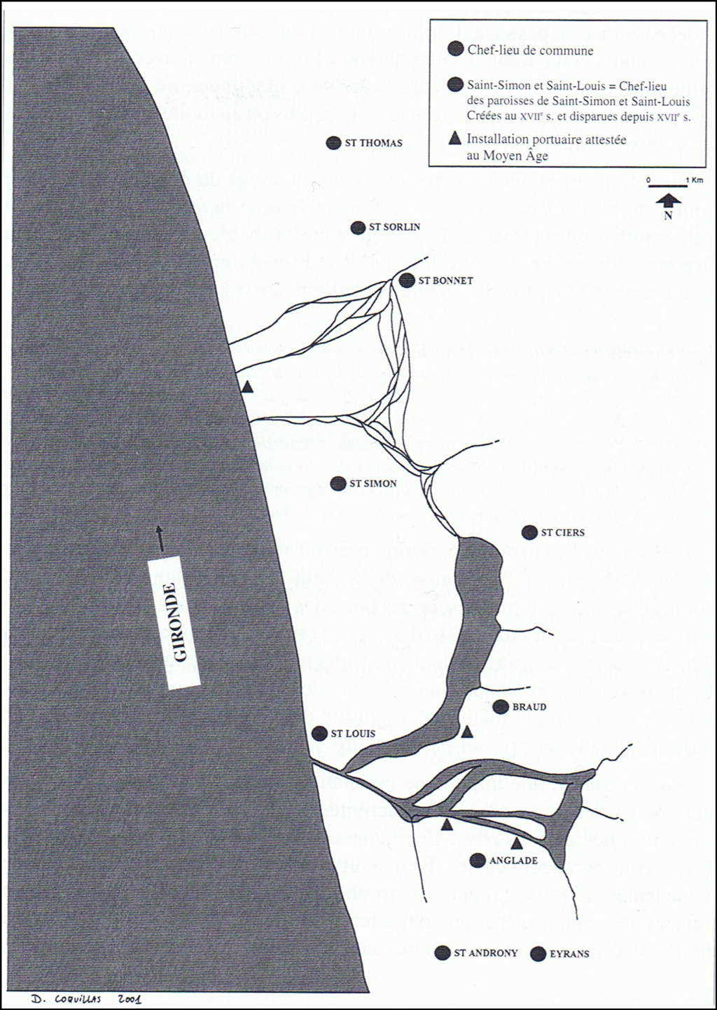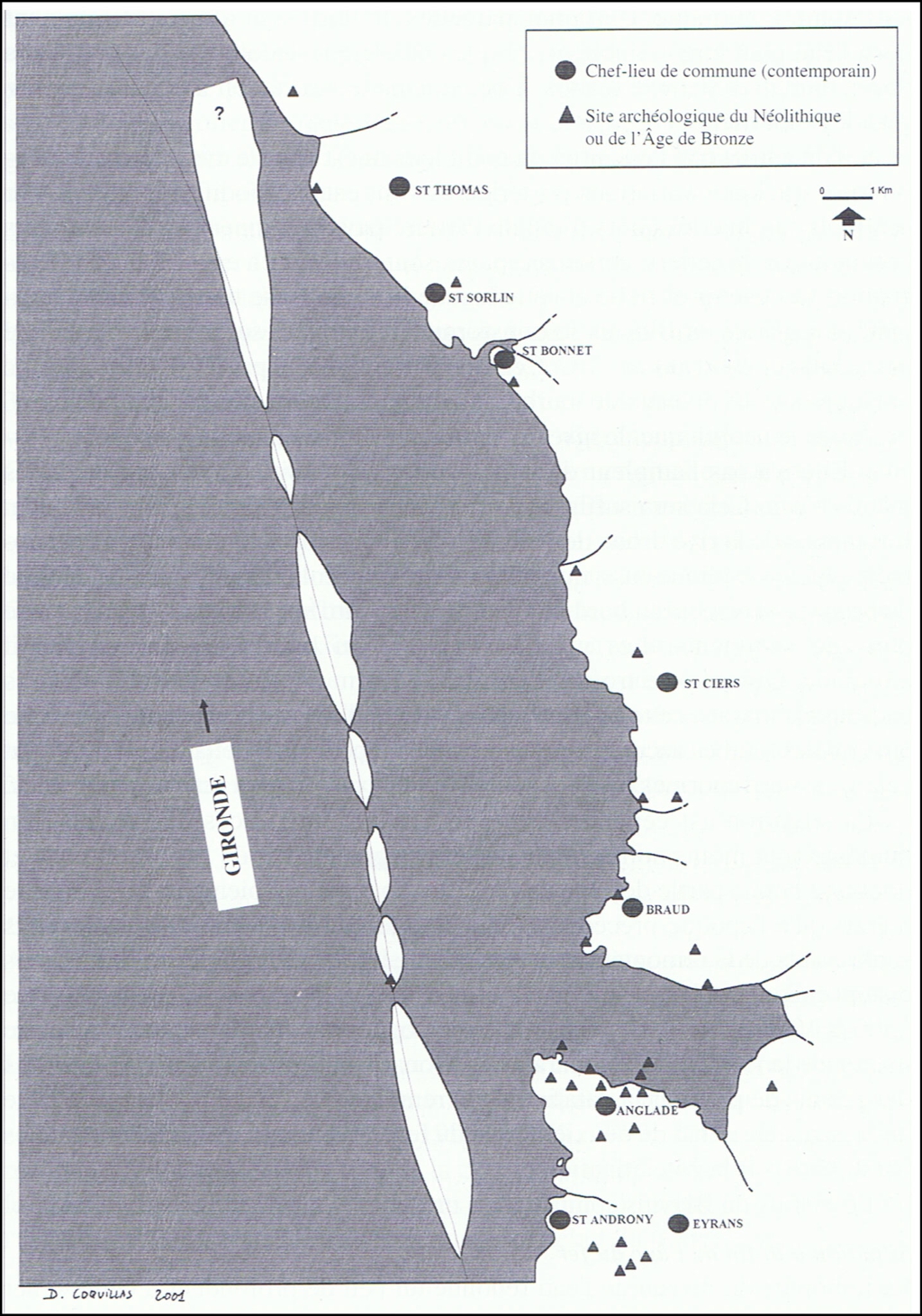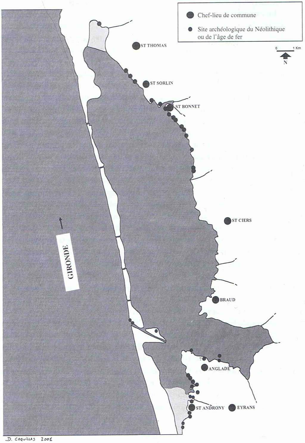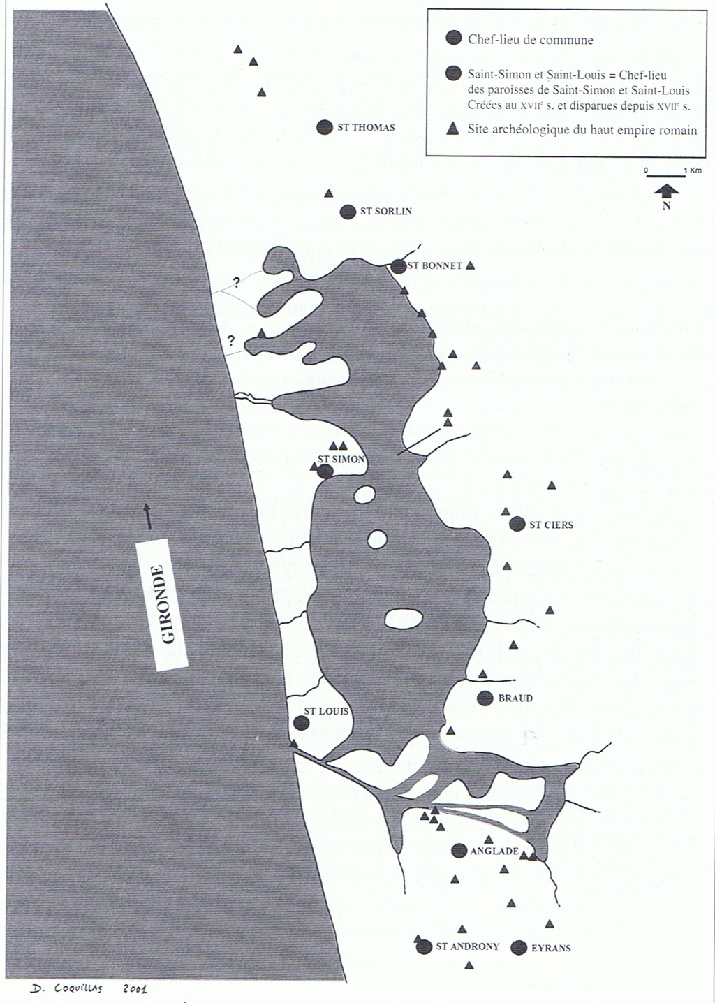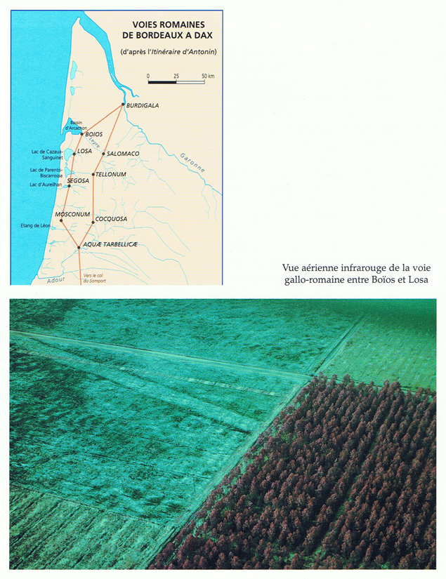 Les piles en bois de ce pont (datées de la deuxième moitié du Ier siècle avant J.-C.) ont été retrouvées, ainsi qu’un fanum (temple) en « garluche » et un important mobilier témoignant de la circulation des hommes et des marchandises (céramiques, monnaies, bijoux, etc.). Au IIIe siècle après J.-C., la montée des eaux rendant ce franchissement impraticable, une dérivation de la voie et un nouveau pont furent aménagés 500 mètres en amont. D’autres témoignages, cette fois textuels, illustrent les contraintes imposées aux hommes par ces milieux mouvants. C’est le cas à partir du XVIe siècle, où l’émergence d’une documentation écrite de type narratif (très différente des sources normatives juridiques de la fin du Moyen Age) permet de saisir les conséquences désastreuses de l’activité dunaire. Ainsi Montaigne, dans un passage des Essais, indique que son frère a vu en Médoc « une siene terre ensevelie soubs les sables que la mer vomit devant elle » ; et d’ajouter : « Les habitans disent que, depuis quelque temps, la mer se poulse si fort vers eux, qu’ils ont perdu quatre lieües de terre ». Claude Masse, au siècle suivant, affirme, dans ses mémoires, avoir vu « plusieurs forêts et grands bois de haute futaie engloutis sous le sable, et passer un cheval sur le sommet des arbres qui ne paroissent plus que par quelques bouts de branchages ». Et de rapporter les dires de paysans affirmant avoir « vu changer de place deux ou trois fois un même village ». De fait, on trouve sur sa carte du secteur du Porge un toponyme « vieille église » situé au milieu du massif dunaire, signalant l’emplacement d’une église ensevelie sous les sables…