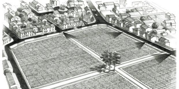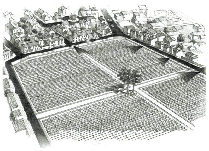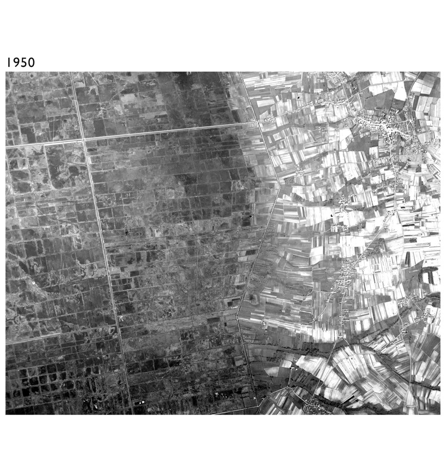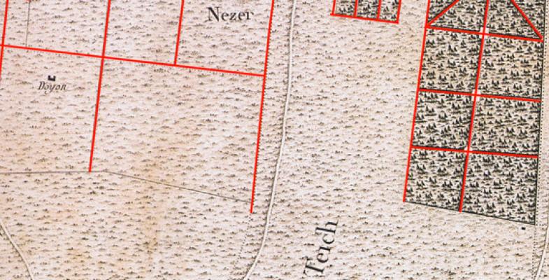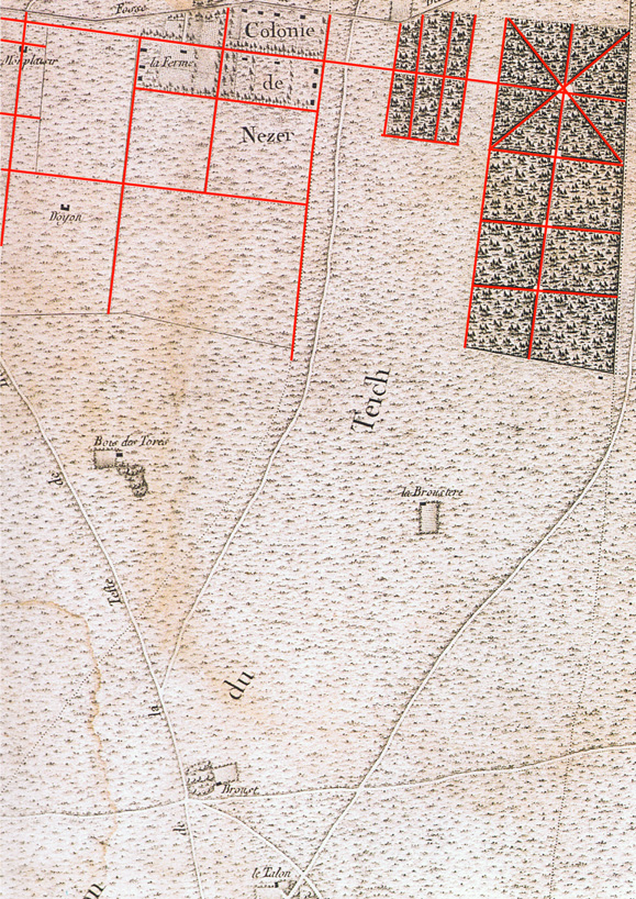 Depuis le Sud et le centre du plateau, la forêt artificielle gagne progressivement vers le Nord au début du XVIIe siècle, sous l’impulsion de seigneurs entreprenants, de parlementaires mais aussi de marchands, de bourgeois et de gros et moyens laboureurs. Au XVIIIe siècle, le mouvement prend de l’ampleur en bordelais où l’on assiste à une véritable fureur de planter, en raison de la demande en bois à brûler et surtout d’échalas pour le vignoble. En revanche, sur la majeure partie du plateau landais, l’absence de drainage et la rareté des communications excluront les grands ensemencements jusqu’au XIXe siècle. À quel type de planimétrie ces opérations ont-elles abouti ? Sur la commune du Teich, les plantations de Daniel Néser, banquier et spéculateur suisse qui engloutira sa fortune dans un projet de colonie agricole, adoptent un ordonnancement géométrique, avec de grandes allées tracées en étoile et des ronds-points centraux qui trahissent les idées de l’urbanisme des lumières.