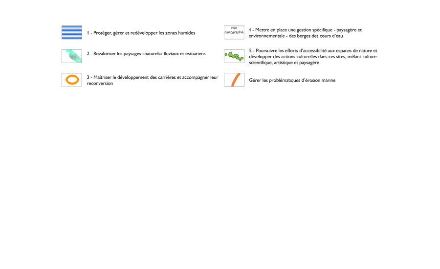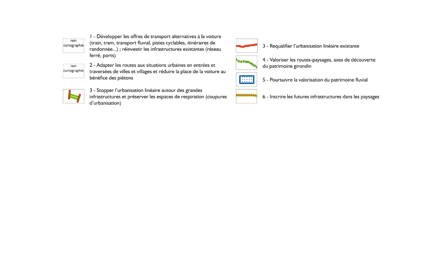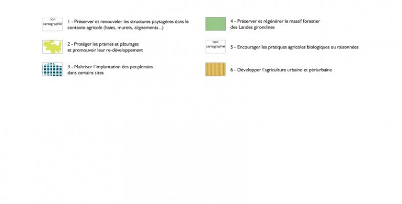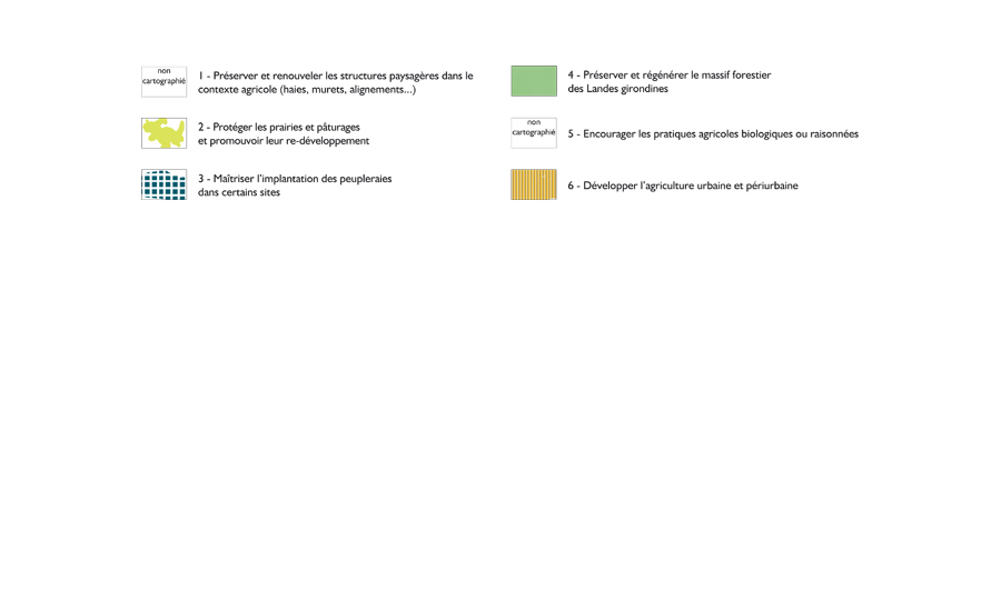 Ces orientations proposées dans l’atlas, une fois débattues et partagées, ont vocation à devenir des « objectifs de qualité paysagère » (l’expression vient de la Convention européenne du paysage), appelés à rassembler les nombreux acteurs du territoire sur une même ambition d’avenir pour les paysages girondins. Cela supposera, pour chaque orientation et dans le cadre d’une concertation qui reste à mener, d’identifier :