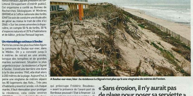 Depuis quelques décennies déjà , on observe, en effet, une dilatation des masses d’eau marine ainsi qu’une fonte accélérée des grands glaciers et des calottes glaciaires à l’origine d’une élévation du niveau des océans. La Gironde, comme tous les départements littoraux, est concernée par ce phénomène qui provoque une érosion dunaire et un retrait de côte plus ou moins accéléré suivant les lieux (il est de l’ordre de 7 mètres par an sur la plage de l’Amélie, à Soulac) ainsi qu’un risque de submersion marine dans certains secteurs.