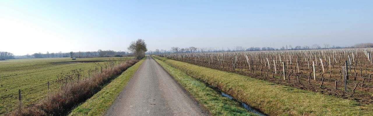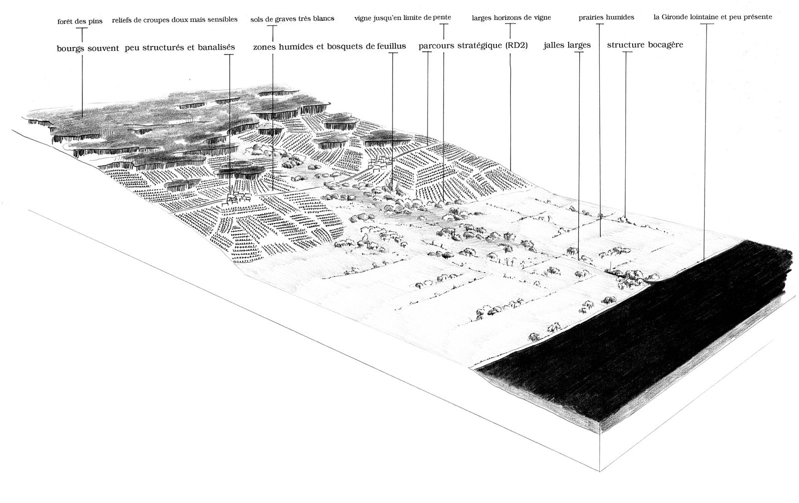Au long des berges, les deux fleuves ont formé des bourrelets alluvionnaires, légèrement surélevés et dont les sols présentent une bonne qualité agronomique. Ces terres ont donc accueilli de longue date les principales implantations - villages, vignes, et plus récemment industries - tandis que le cœur, bien plus humide, était géré en pâtures et marais de chasse. Avant même le tracé de routes sur le Bec d’Ambès, la possibilité d’y accoster en bateau depuis Bordeaux rendait ces rives attractives : la noblesse y a fait construire, dès le XVIIème siècle, des demeures de villégiature (bien visibles sur la carte de Belleyme). Cette tendance se confirmera avec le développement de la viticulture sur ces terres fertiles, durant les XVIIIème et XIXème siècles.Aujourd’hui, la D10 offre un itinéraire privilégié de découverte des paysages de berges. Elle traverse des configurations variées, profite de la présence du patrimoine bâti ancien, partiellement préservé, et offre des vues inégalées sur la Garonne comme sur la Dordogne. Au long d’un corridor végétal présentant différentes ambiances arborées - qu’il s’agisse d’alignements plantés ou bien de haies développées spontanément - des ouvertures se dessinent, plus ou moins importantes, et offrent un contact de proximité avec le fleuve. Mais l’importance et la vitesse de la circulation sur ces routes ne permettent pas de profiter de ce potentiel : le trafic lié aux zones industrielles reste important (malgré la proximité de la D113) et très peu d’endroits laissent la possibilité de s’arrêter.