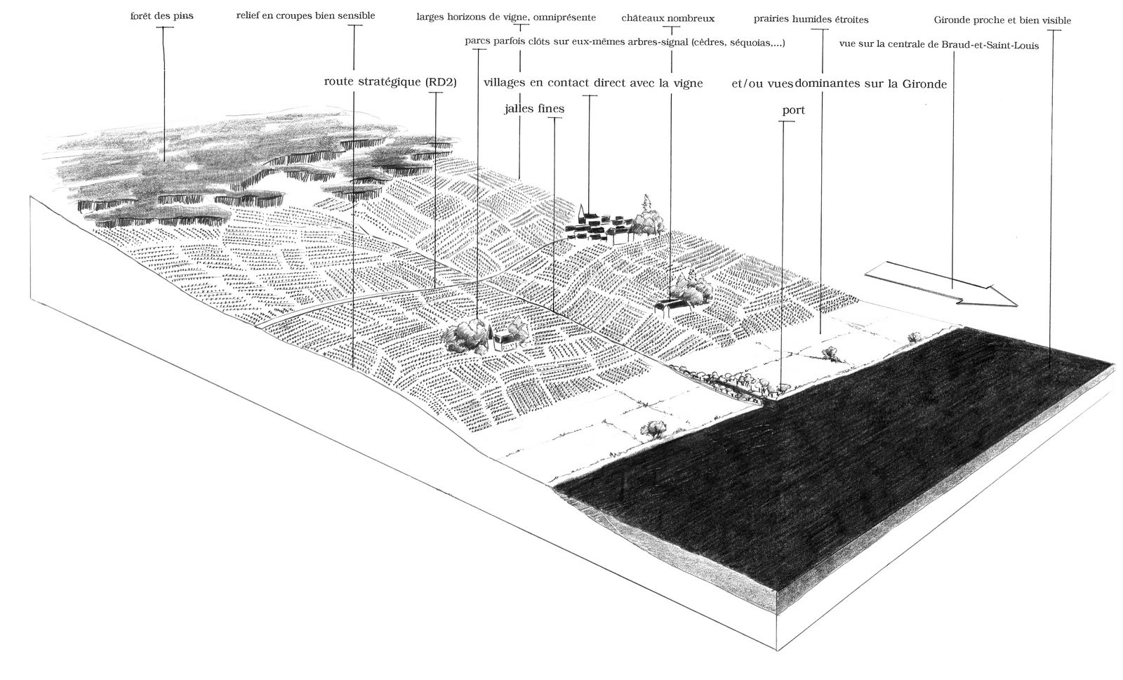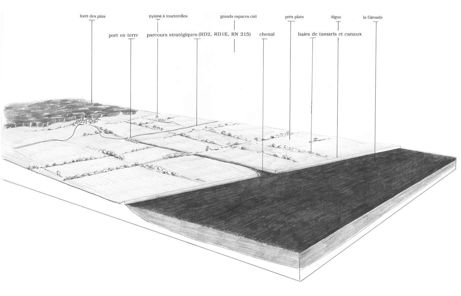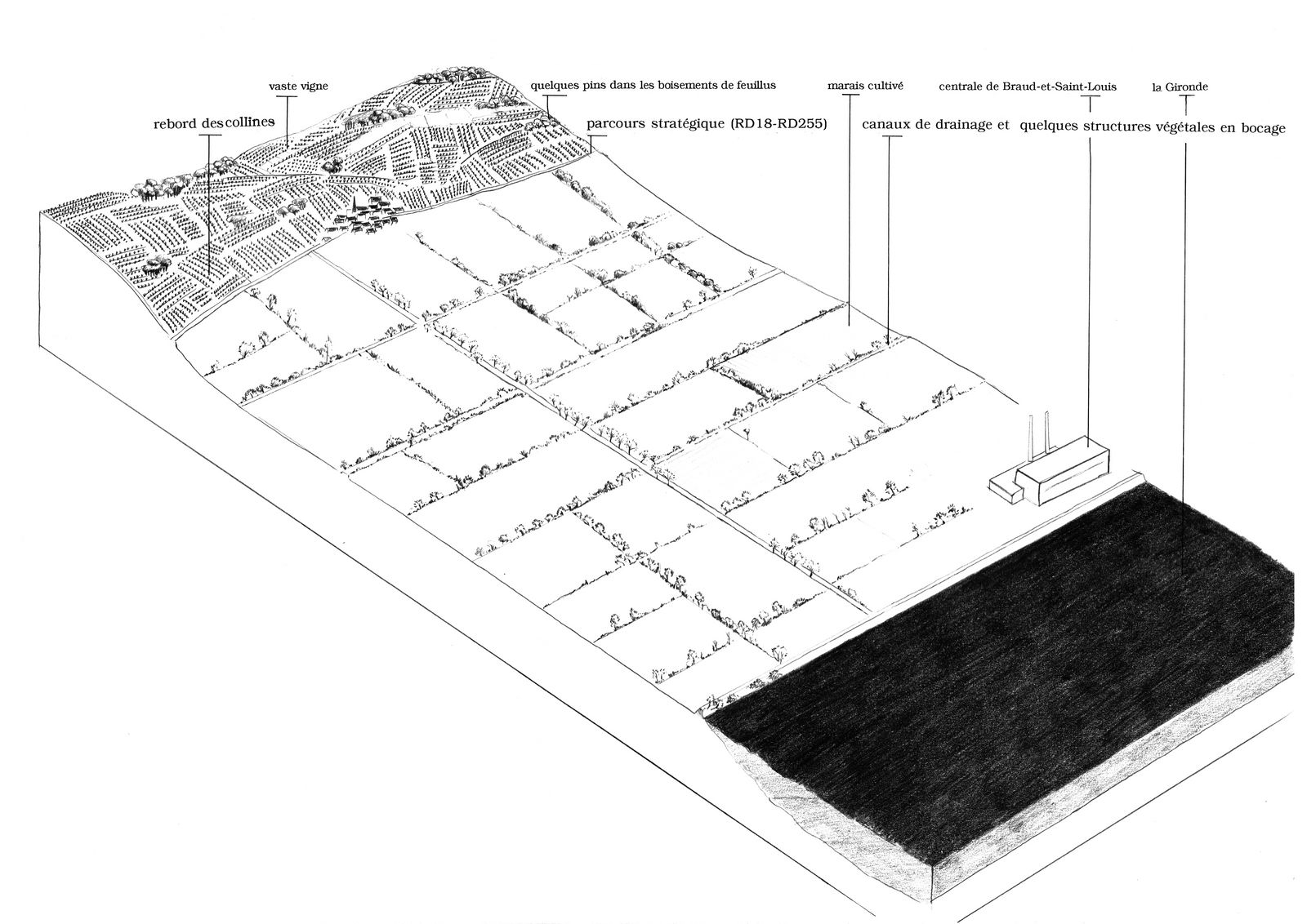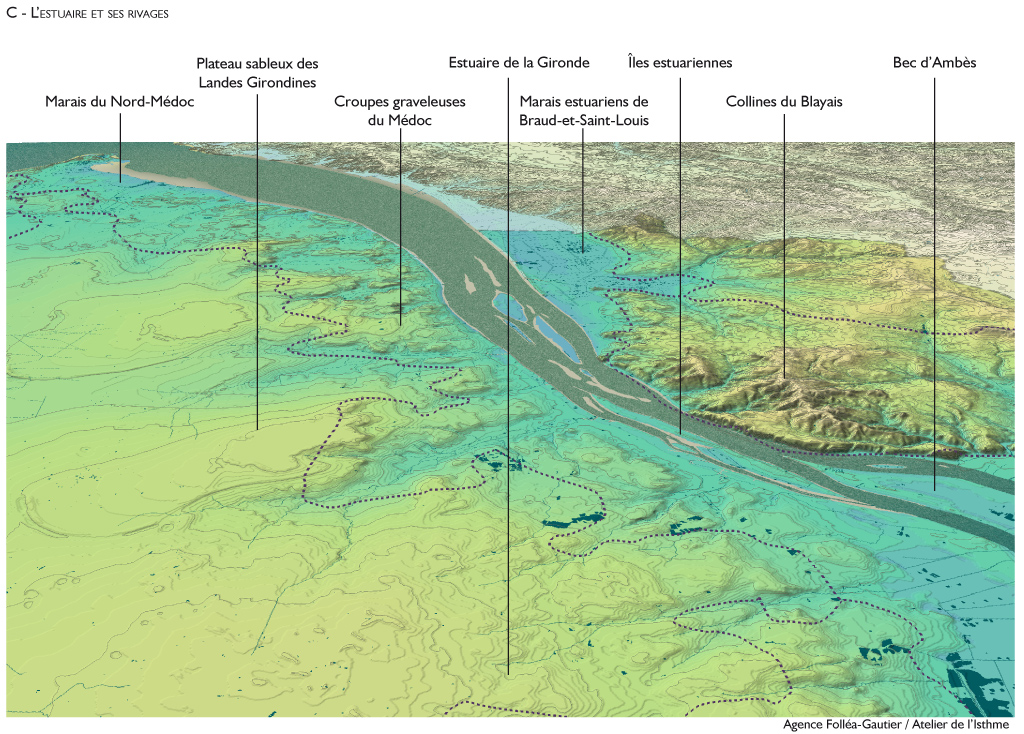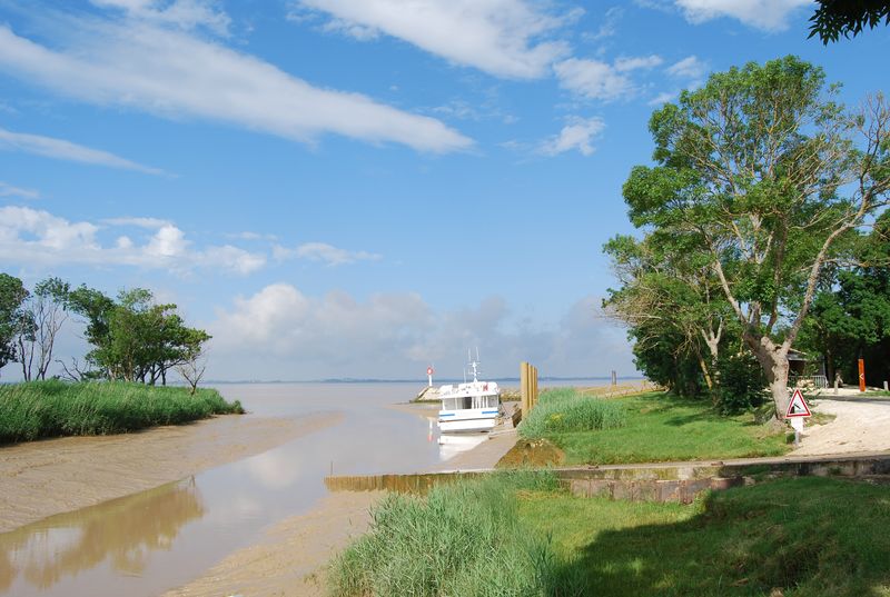 Au-delà du Bec d’Ambès, rejeton terrestre de ces eaux, la rencontre entre Garonne, Dordogne et Atlantique donne ici naissance à un estuaire hors d’échelle, paysage aquatique majestueux qui longe les terrasses alluviales du Médoc en rive gauche, les marais de Braud-et-Saint-Louis en face. Les eaux des deux fleuves ont longtemps enrichi ces rives de nombreux matériaux, constituant d’une part des terrasses de graves bien drainantes, propices au développement du vignoble, et d’autre part des palus que le travail de l’homme a rendu exploitables en prairies et labours. Depuis les berges de la Gironde s’étalent donc les marais cultivés et pâturés, organisés par de complexes réseaux de drainage et accueillant des ports presque en pleine terre, surplombés par des pentes aux vignes soigneusement cultivées et ponctuées de châteaux.