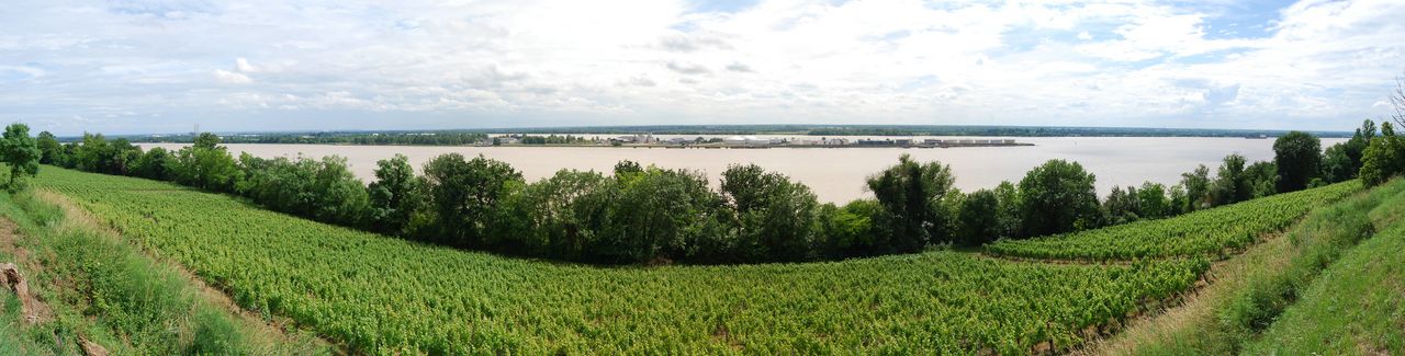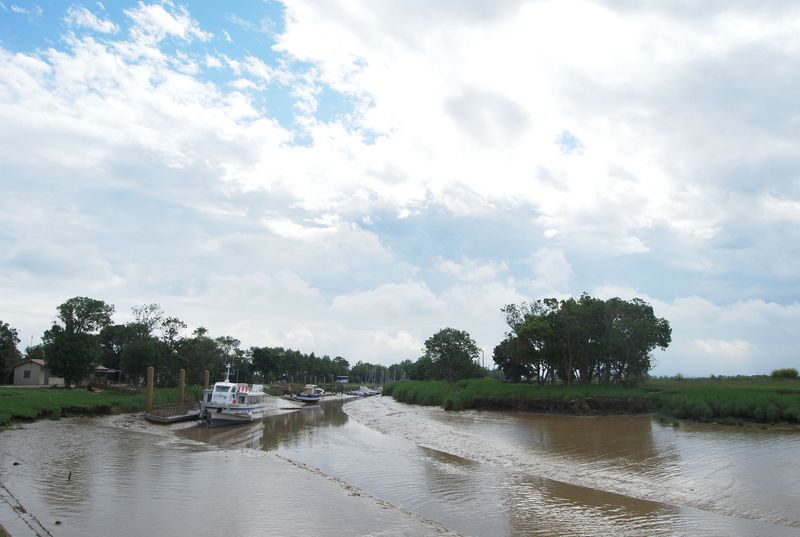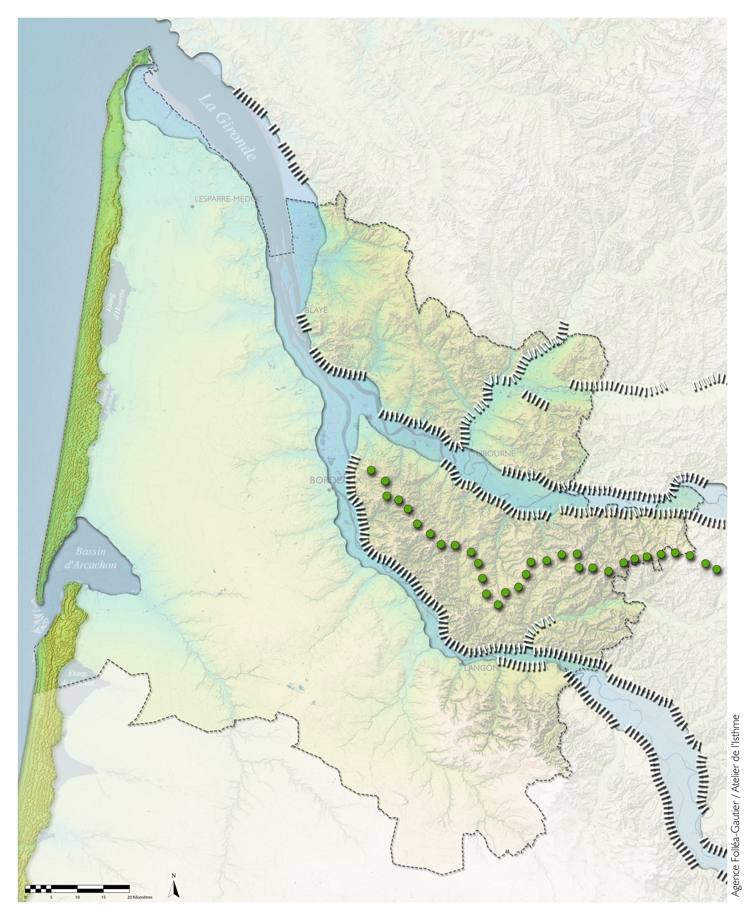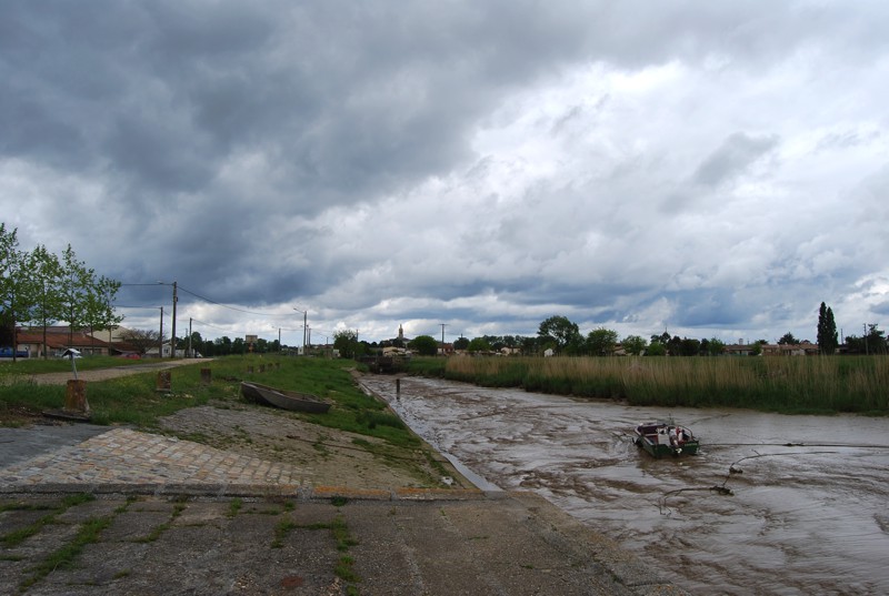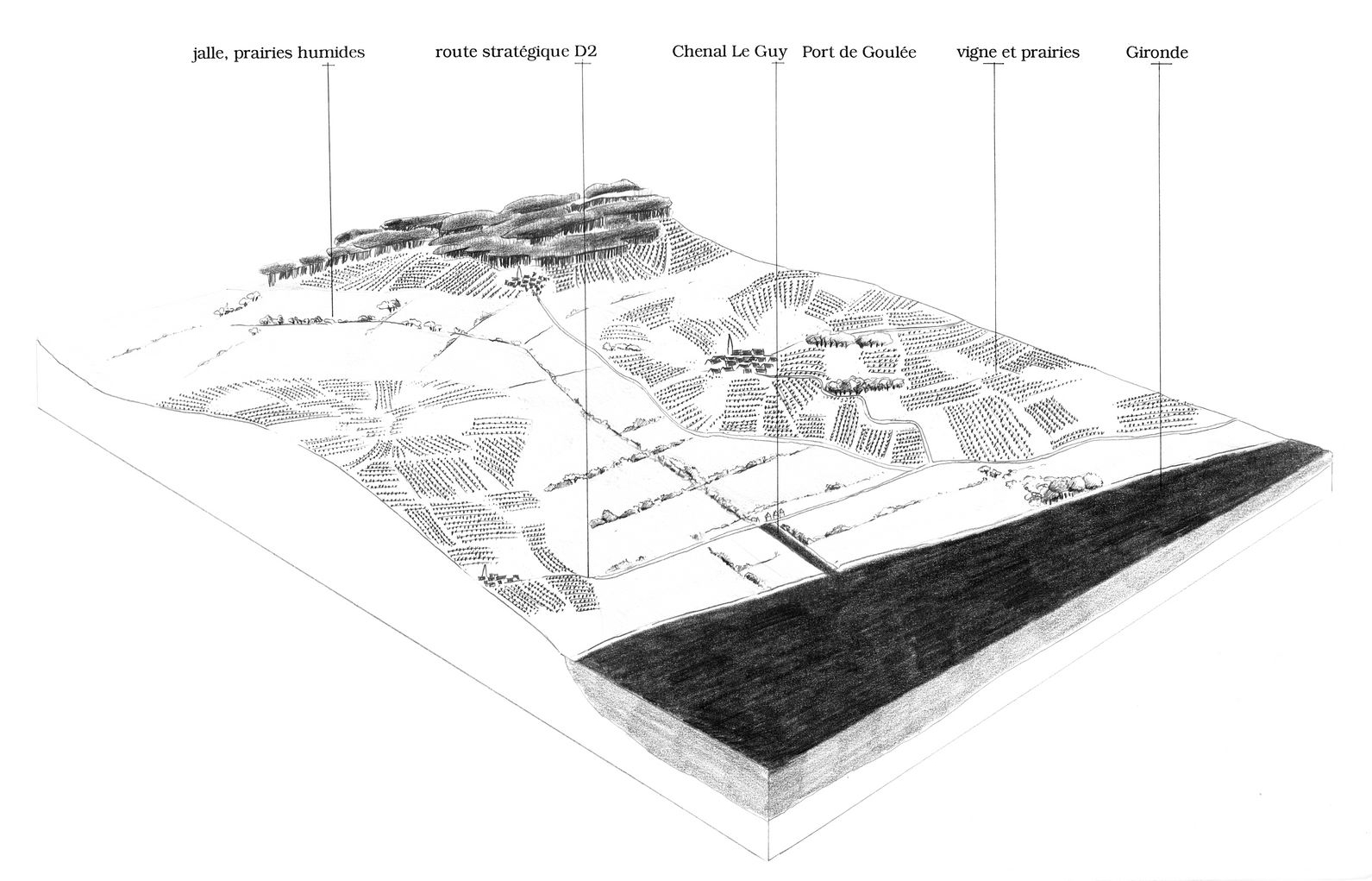 Au-delà du Bec d’Ambès, rejeton terrestre de ces eaux, la rencontre entre Garonne, Dordogne et Atlantique donne ici naissance à un estuaire hors d’échelle, paysage aquatique majestueux qui longe les terrasses alluviales du Médoc en rive gauche, les marais de Braud-et-Saint-Louis en face. Les eaux des deux fleuves ont longtemps enrichi ces rives de nombreux matériaux, constituant d’une part des terrasses de graves bien drainantes, propices au développement du vignoble, et d’autre part des palus que le travail de l’homme a rendu exploitables en prairies et labours. Depuis les berges de la Gironde s’étalent donc les marais cultivés et pâturés, organisés par de complexes réseaux de drainage et accueillant des ports presque en pleine terre, surplombés par des pentes aux vignes soigneusement cultivées et ponctuées de châteaux.
