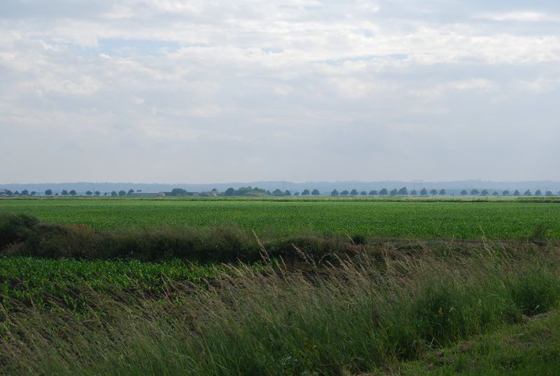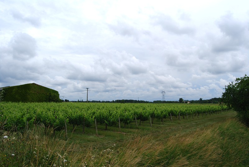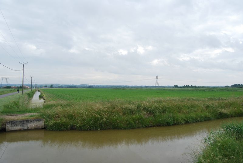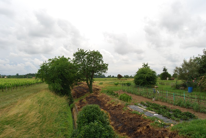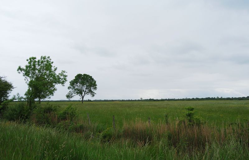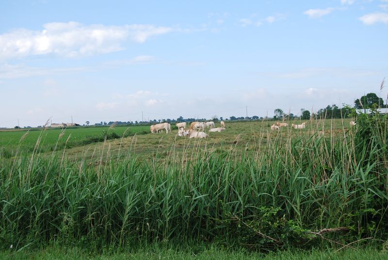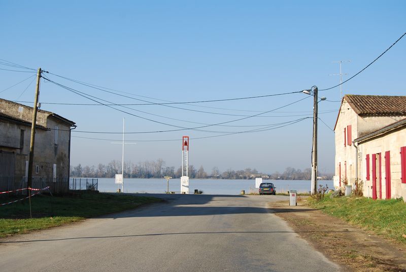 A l’abri des digues, de vastes parcelles marécageuses sont exploitées en cultures (maïs) ou en prairies, déployant leurs palettes vertes sur de grands espaces. Bien que l’on n’y trouve aucun boisement d’envergure, les arbres sont très présents dans ces marais, bordant les parcelles et les cours d’eau en rideaux denses de feuillus, superposant un horizon sombre aux cultures très ouvertes. Ces haies longent parfois aussi les voies de communication, dessinant alors des routes en tunnels végétaux opaques. Bien que très peu nombreuses, on trouve également quelques vignes, sur les bordures nord et ouest de l’unité, les premières en aval de Bordeaux. L’origine artificielle de ces terrains se traduit aujourd’hui par une topographie tout à fait particulière. En effet, les terres les plus basses sont les plus éloignées des berges, la digue ayant maintenu autour d’elle un bourrelet de terrain plus élevé. Cette cuvette, au réseau de drainage bien plus dense mais toujours plus humide malgré tout, a développé un sol tourbeux, distinct des terrains en bord de fleuve. L’implantation du bâti s’en ressent également : l’urbanisation (très limitée) s’est concentrée derrière la digue, au long de la D209, tandis que les zones inondables restent presque désertes.