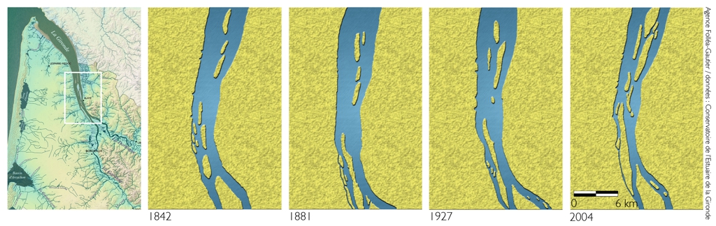 Les interventions humaines ont eu tendance à appauvrir l’archipel des îles estuariennes, principalement dans le but de conforter les chenaux de navigation : ainsi, l’Île Cazeau, l’Île du Nord et l’Île Verte ont été réunies au XIXème siècle, de même que l’Île Nouvelle et l’Île Bouchaud. Par ces interventions, les courants sont concentrés et permettent de maintenir un effet de chasse plus efficace. Mais les paysages s’en trouvent simplifiés : les îles deviennent des bandes de terre ou disparaissent, et avec elles les petits bras aux ambiances riches et intimes.