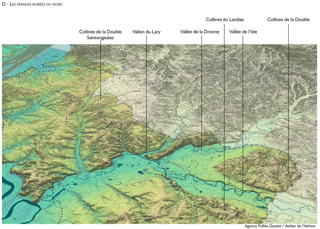 Bien que peu élevés - entre 30 et 60 m environ - les coteaux forment clairement le cadre de ces vallées : couverts de boisements, ils présentent un horizon forestier continu qui délimite le paysage. Ils sont également dissymétriques : pour l’Isle comme pour la Dronne la rive droite présente un profil très abrupt, et la gauche une pente nettement plus douce. Là encore, c’est la couverture boisée qui permet d’unifier l’ensemble.
