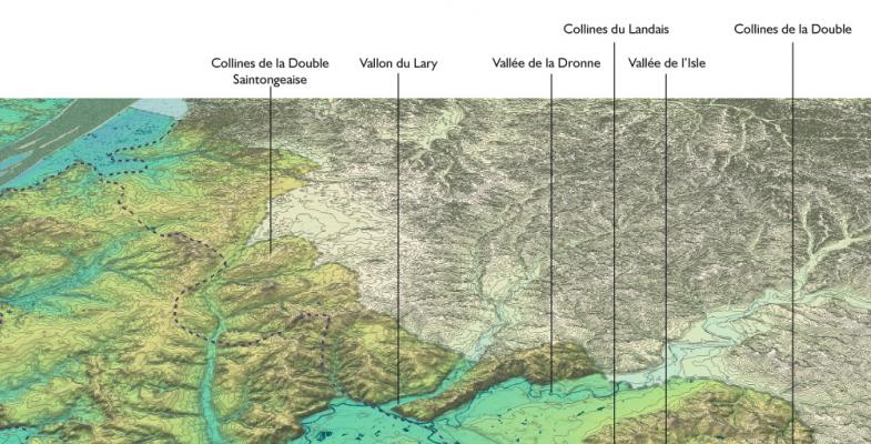 Un autre facteur vient enrichir le relief : deux terrasses se succèdent au pied des coteaux, séparées par une rupture plus ou moins marquée, le fond de vallée étant formé d’un sol alluvionnaire tandis que des boulbènes constituent les replats supérieurs. Si le socle des collines de la Double est délimité par une ’marche’ franche - notamment en rive droite de l’Isle - les pieds de coteaux du Landais et de la Double Saintongeaise sont prolongés par des terrasses moins lisibles. Dans tous les cas, les implantations urbaines d’origine soulignent souvent les bordures de ces paliers : quelques alignements de maisons installées en balcon marquent les limites bâties anciennes ; ailleurs, c’est l’enfrichement de ces talus difficilement exploitables qui signalera leur présence par les boisements. Les lits majeurs actuels des rivières sont aussi bornés par ces limites topographiques, les méandres de l’Isle se glissant au pied de ces berges abruptes.