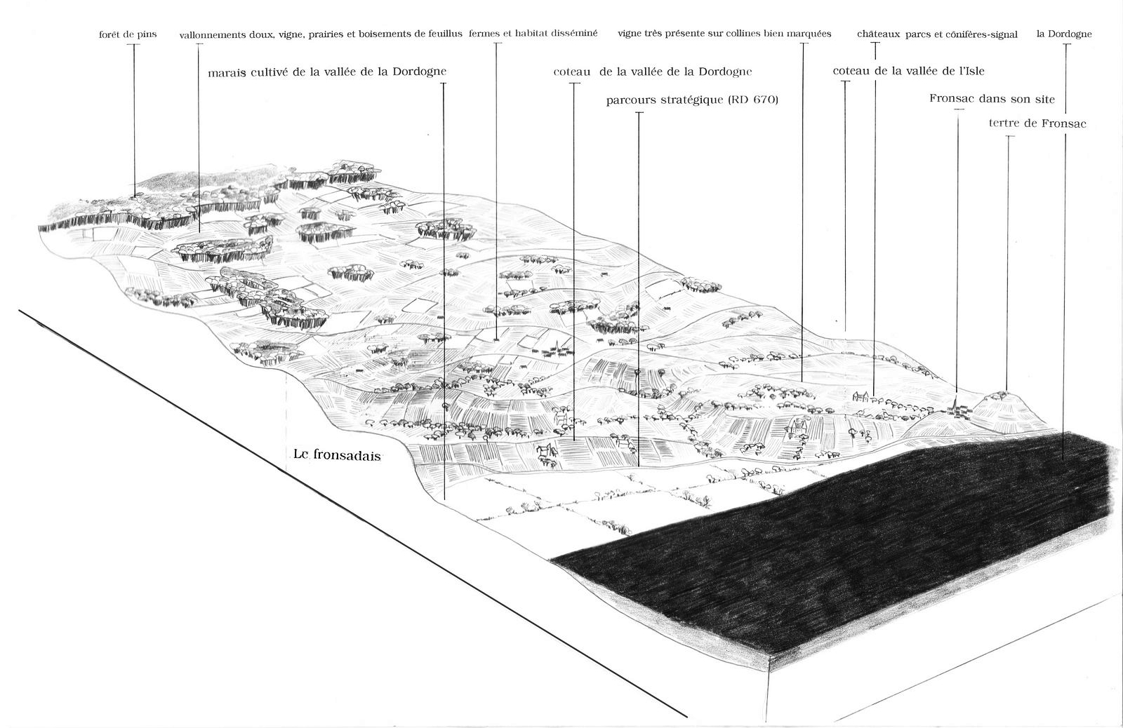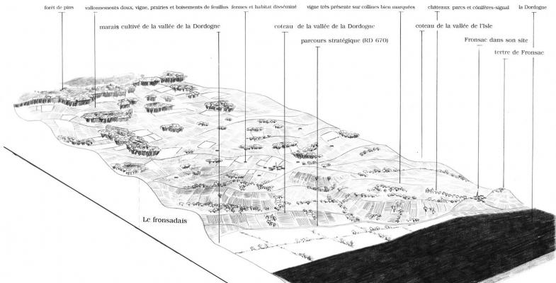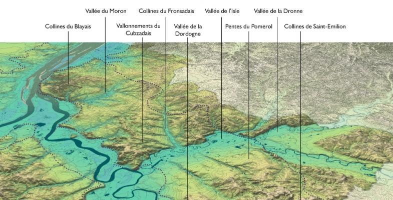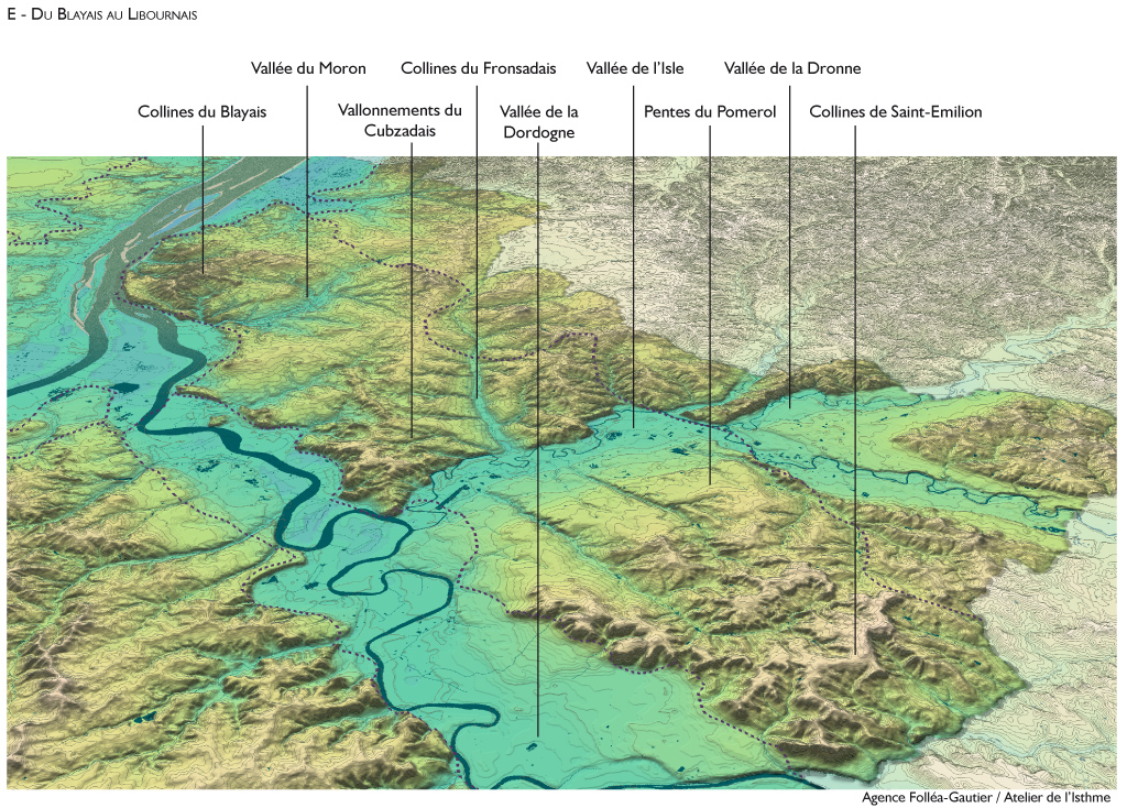 Suivant la rive droite de la Dordogne, puis de l’estuaire, une large bande, constituée de reliefs successifs plus ou moins marqués, se démarque par sa vocation résolument viticole. Saint-Emilion, Pomerol, Fronsac, Côtes de Bourg et Côtes de Blaye se succèdent, surplombant les cours d’eau de leurs coteaux peignés par les rangs réguliers de vigne, de leurs imposantes silhouettes bâties, et de leurs hautes falaises de calcaire. Au sein de ces paysages viticoles, la répartition des forêts ou du bâti est liée directement à la valeur de la vigne : extrêmement précieuse, elle est omniprésente à Saint-Emilion ; tandis que le Cubzadais la voit d’avantage mêlée aux boisements.