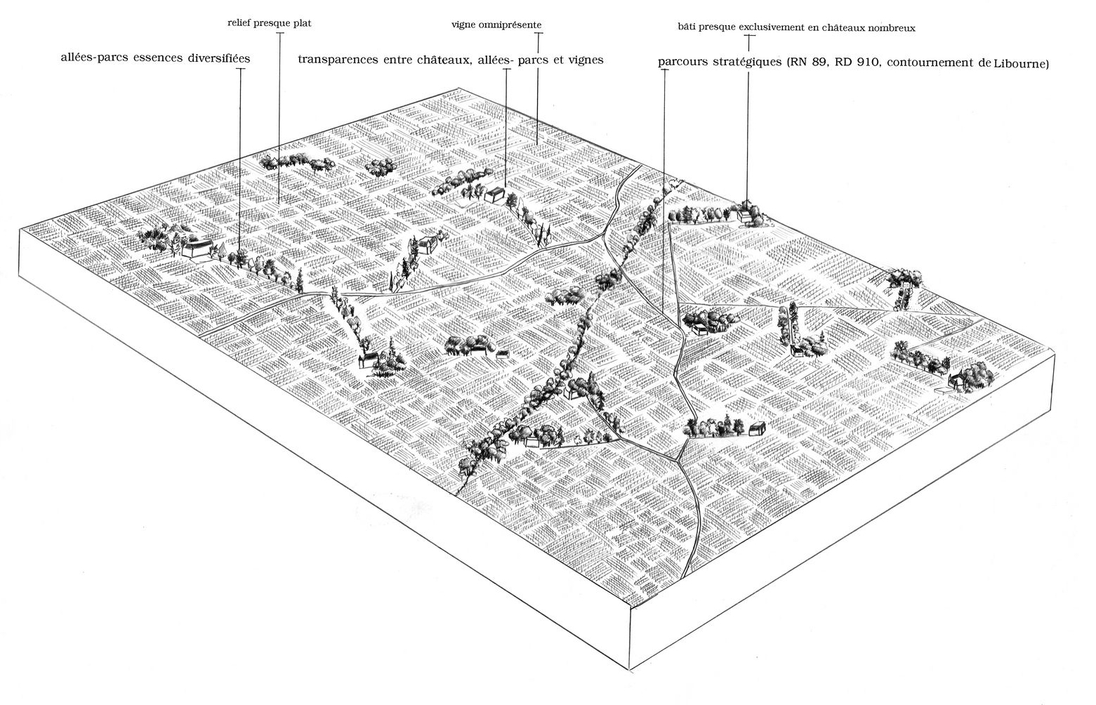 Entouré de ses vignes, le château se doit d’entretenir au mieux ses cultures, qui pour lui font office d’écrin ; une allée plantée assurera sa visibilité sans sacrifier de terres à la composition d’un parc ; des clôtures permettront d’affirmer l’emprise du domaine tout en donnant à voir sa splendeur viticole. Ces éléments, variant plus ou moins d’un château à l’autre, valorisent ces paysages de façon originale tout en apportant une certaine diversité dans ces horizons de monoculture.