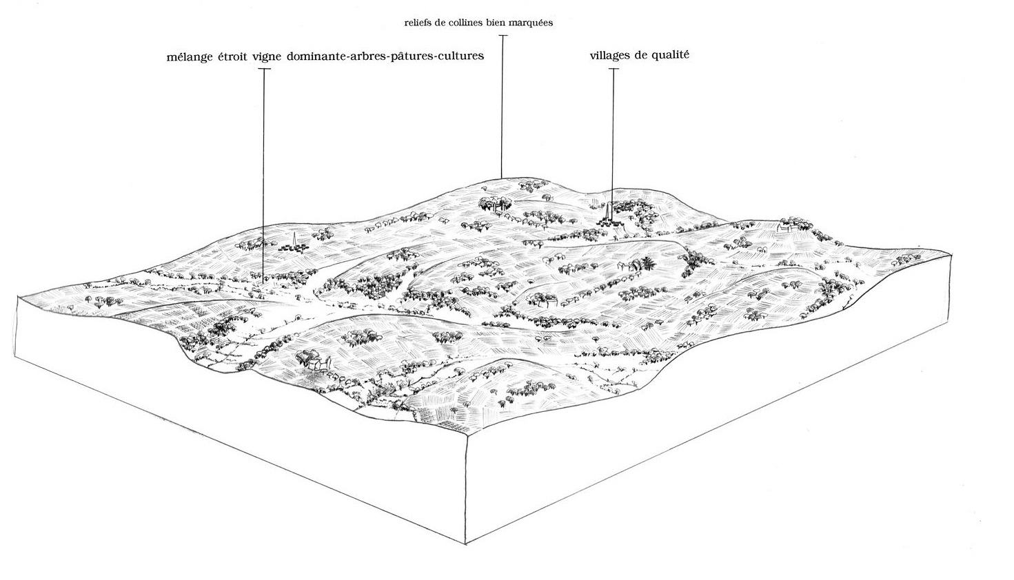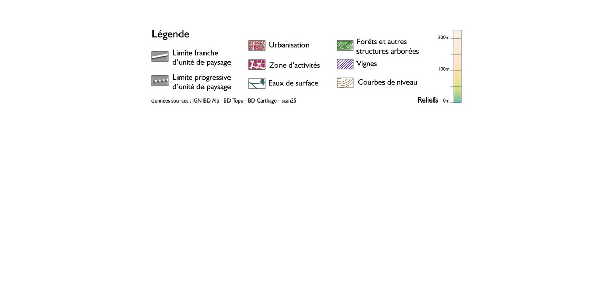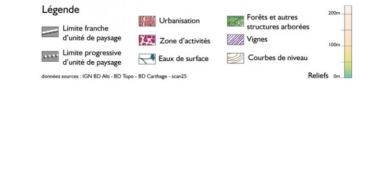 Dans ce territoire si uniformément viticole, les nombreux vallons qui modèlent le terrain créent de modestes ruptures. Etroits et escarpés au sud-ouest, moins nets au nord et à l’est, ils forment dans tous les cas des variations topographiques génératrices de diversité paysagère. Le passage des routes à flanc de coteau ou en remblais crée des conditions idéales pour dégager de larges vues sur les paysages de vignobles agrémentés de bosquets ou de structures végétales.