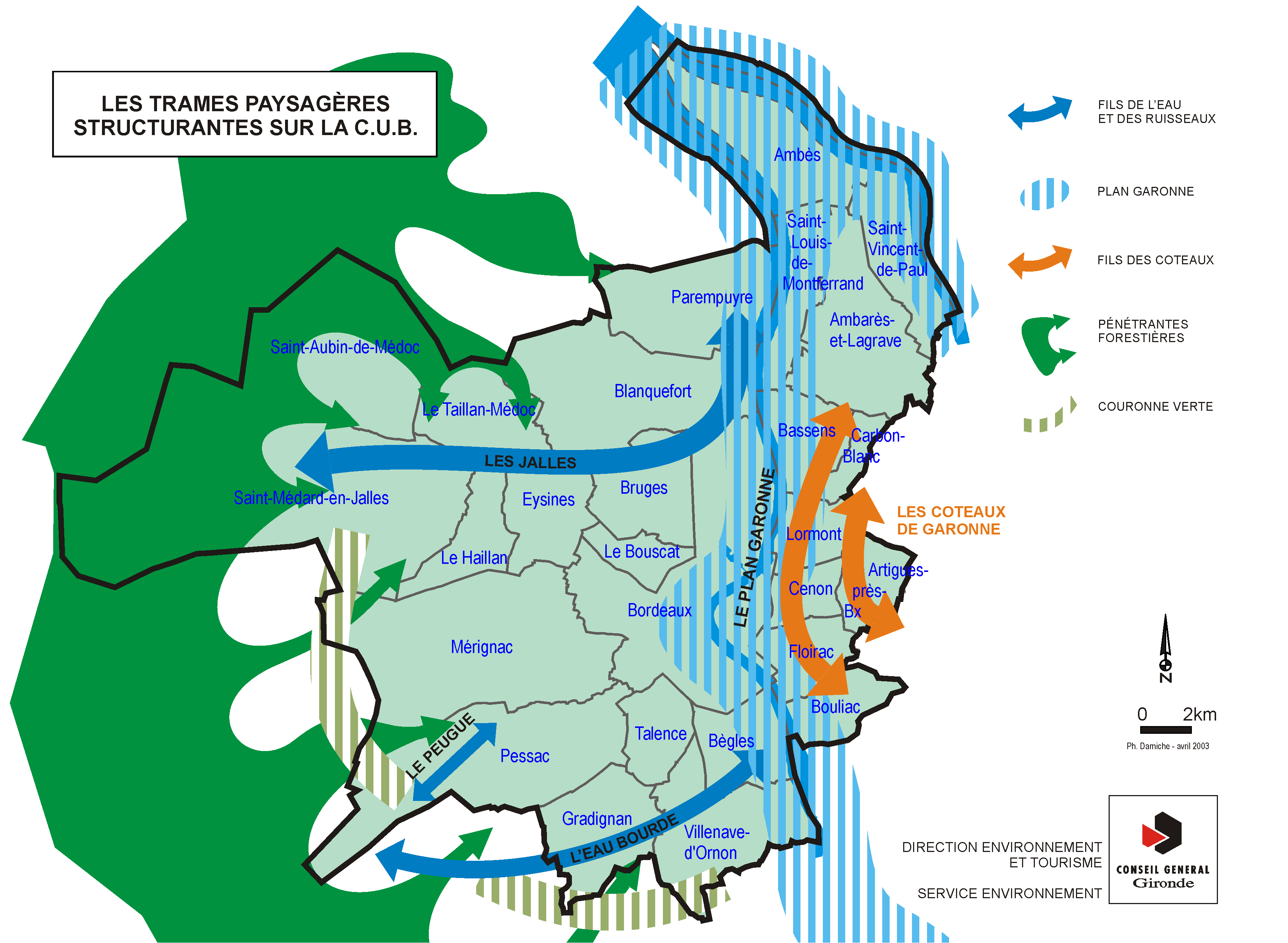 Parmi ceux-ci, le ruisseau de l’Eau Bourde constitue un exemple intéressant de mise en valeur par les communes riveraines : continuité de circulations douces liées au fil de l’eau ; mise en valeur d’espaces ouverts en accompagnement de l’eau : parc forestier du ruisseau de l’Eau Bourde (Canéjan), entrées de villes vertes et préservées de Cestas (entre Cestas et A 63), et Canéjan (entre RN 10 et Canéjan), Prieuré du Cayac, Théâtre des Quatre Saisons, plaine de sports et Parc Municipal de Mandavit à Bègles, Parc Torres Vedras vers Canteloup… Cet exemple montre l’importance d’anticiper en préservant de généreux espaces en bord de rivière dans les secteurs plus périphériques de l’agglomération, sur le plateau des landes Girondines comme dans l’Entre-deux-Mers : outre leurs fonctions écologiques de corridors biologiques (trame bleue), ils ont vocation à cristalliser des espaces de respiration aux usages précieux pour la qualité du cadre de vie en milieu habité. Le Schéma directeur de 2001 avait d’ailleurs pris des dispositions en ce sens.