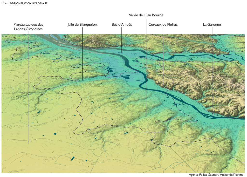 Au-delà de la ville de Bordeaux, l’agglomération compose un ensemble de plusieurs paysages urbains répartis sur les deux rives de la Garonne ; de multiples quartiers et communes aux identités marquées forment cette aire urbaine. Sur le pourtour, la rencontre entre la ville et les paysages alentour forme des interfaces différentes : la Garonne, les marais, la forêt de pins, la vigne, le coteau de Lormont ne créent pas une ceinture uniforme autour de Bordeaux. Si certaines extensions urbaines récentes tiennent compte de ces différences de contexte, d’autres présentent un urbanisme banal et inadapté aux spécificités locales.