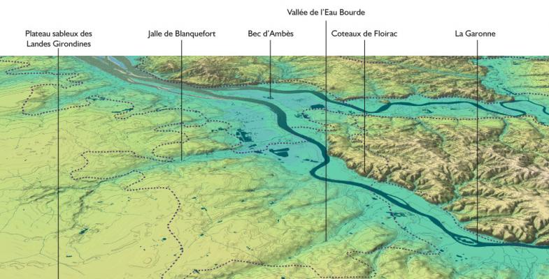 La large Garonne offre une ample ouverture vers la rive droite. Au-delà des terres basses progressivement aménagées pour l’agriculture puis l’urbanisation du quartier de la Bastide, la vue s’arrête sur le remarquable coteau de Lormont. De loin, il se présente aujourd’hui comme une longue vague verte, couvert d’une végétation qui coiffe les soixante mètres de dénivelés marquant le rebord de l’Entre-deux-Mers. Il meurt en douceur à Bassens dans l’amorce de la presqu’île du Bec d’Ambès. Depuis ses hauteurs, de larges vues urbaines s’ouvrent sur la ville et son fleuve. Le site apparaît particulièrement précieux dans le contexte très aplani du relief de Bordeaux, offrant un balcon investi comme lieu de villégiature et aujourd’hui identifié dans la trame paysagère de l’agglomération comme Parc des Coteaux.