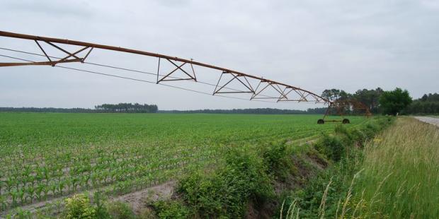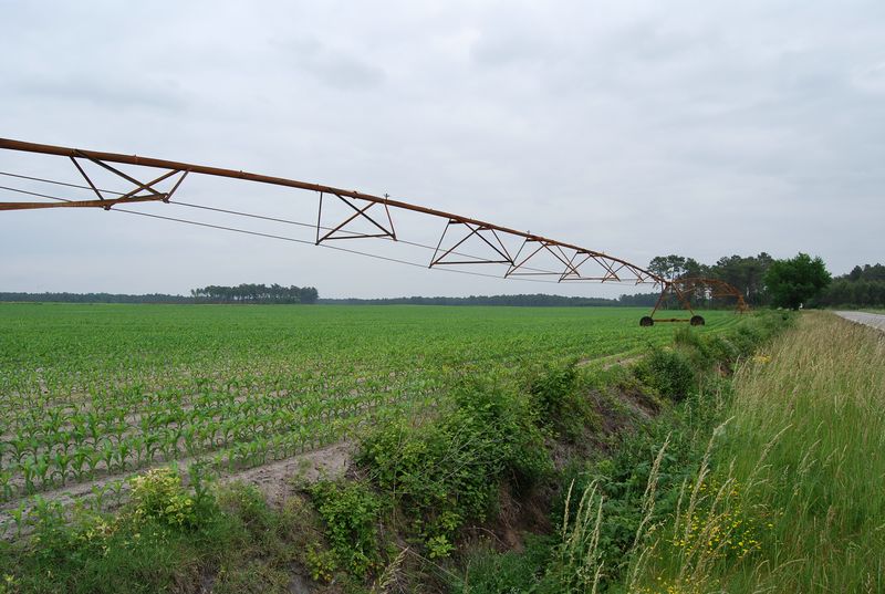 Suite aux grands incendies des années 1940, un nouveau modèle de culture s’est imposé : sur les vastes zones détruites par le feu, la forêt a laissé la place à de gigantesques parcelles de maïsiculture. Implantées sur les landes humides, celles-ci nécessitent des systèmes de drainage importants, qui tendent à menacer les biotopes propres à ces milieux. Mais parallèlement, les besoins en eau du maïs sont compensés par une irrigation conséquente, qui peut porter préjudice à la nappe phréatique. En termes de paysage, si ces clairières aux horizons très dégagés apportent une ouverture bienvenue et des espaces de respiration au cœur de la pinède, elles ne présentent pas de réelle richesse paysagère. L’absence de reliefs et de toute structure végétale, la transition nette des cultures aux boisements, n’offrent au regard qu’une opposition brutale entre plein et vide. Dans certains secteurs, le maïs laisse la place à des cultures maraîchères (carottes, haricots...) ou horticoles (tulipes) sur de grandes surfaces.