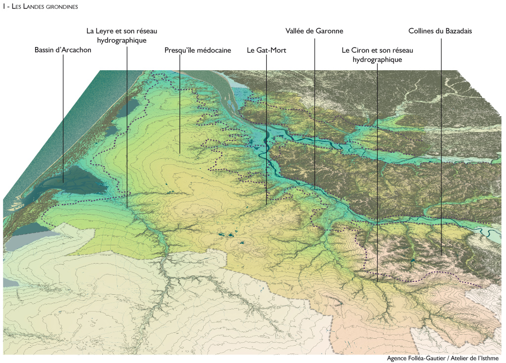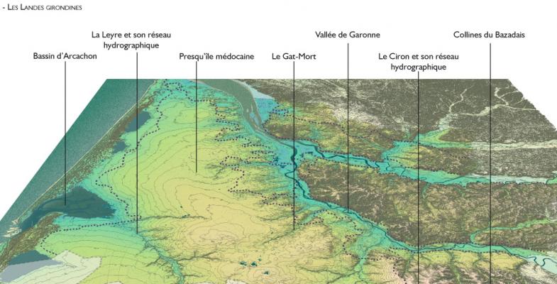 Aborder les landes girondines, qui se prolongent largement au sud pour couvrir le département voisin des Landes jusqu’à l’Adour, c’est plonger dans un paysage particulièrement étrange, d’abord marqué par l’immensité. Une immensité atypique en France et en Europe, où les paysages changent à des échelles plus rapides. Ici, aucun accident topographique majeur : le plateau sableux s’étire imperturbablement à l’horizontale, et porte aujourd’hui un océan de pins maritimes sur 1,4 millions d’hectares, comme il portait hier une mer infinie de landes humides dévolues aux troupeaux. Pour l’automobiliste pressé, cette immensité déroule sur des kilomètres de routes rectilignes un kaléidoscope de troncs démultipliés à l’infini. Mais les landes girondines, au-delà d’une monotonie apparente, sont d’abord ce réservoir d’espace unique en Europe, un territoire d’évasion. Cette valeur de l’étendue interroge nécessairement les projets en cours et à venir, qui pourraient la clôturer (photovoltaïque) ou la couper (lignes TGV, projet de voie de contournement de Bordeaux).