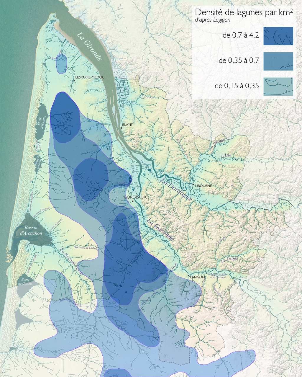 L’eau est donc très présente dans ces paysages, même si elle reste souvent discrète : qu’il s’agisse des lagunes ou tourbières constituées naturellement ou des fossés de drainage creusés de main d’homme (les crastes), elle dessine des motifs particuliers et des réseaux complexes, apportant une certaine richesse écologique et paysagère dans les sous-bois de la pinède industrielle. Discrètement éparpillées dans la forêt en archipels, lagunes et zones humides occupent les légères dépressions de terrain plus ou moins envahies par l’eau de la nappe phréatique. Elles composent de nouvelles ambiances, intimes et mystérieuses, en général de grande qualité paysagère. Elles se présentent comme des mares ou des étangs de quelques mètres ou dizaines de mètres de diamètre, miroirs d’eau silencieuse et immobile, qui reflètent précisément les pins alentours : une dimension verticale qui s’oppose soudain aux immensités horizontales du plateau.