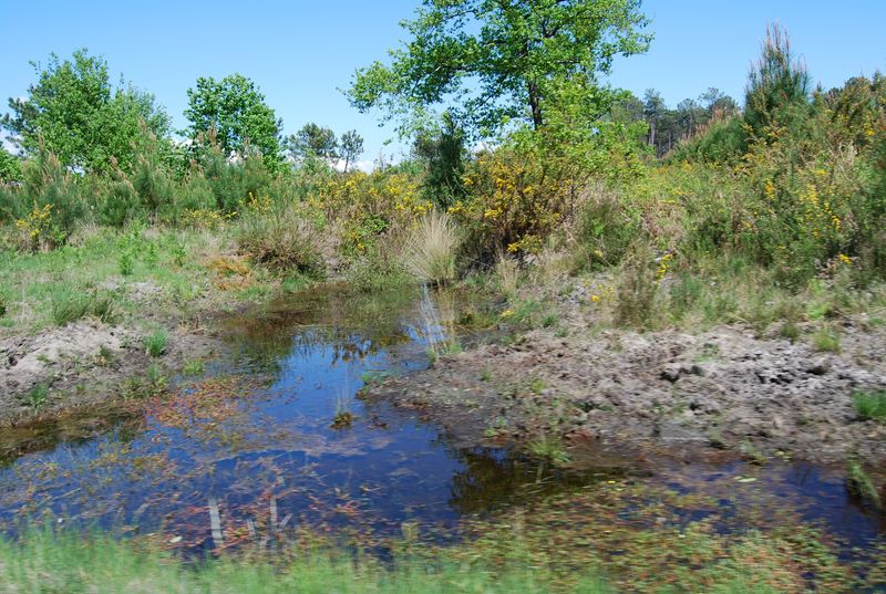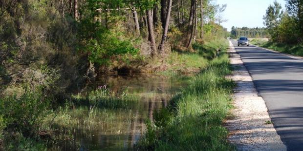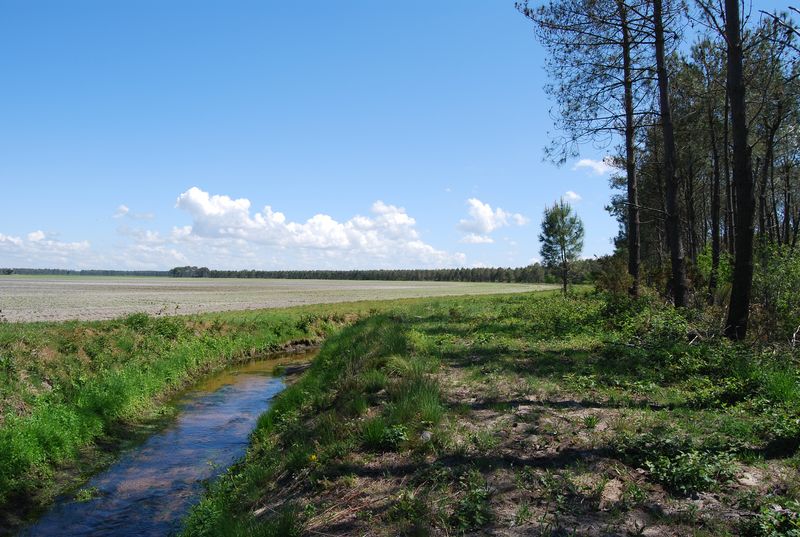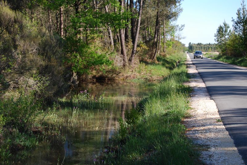 Les nombreux fossés creusés par l’homme afin d’ensemencer ces landes dessinent aussi un réseau important, structure discrète de ce paysage construit. Mais la valeur paysagère de ces crastes reste au stade de potentiel à développer, car les pratiques sylvicoles laissent rarement l’espace nécessaire au développement d’une ripisylve. Au sein des boisements résineux, on lit donc très peu leur présence, qui ne se révèle un bref instant que lorsque la route franchit leur cours.