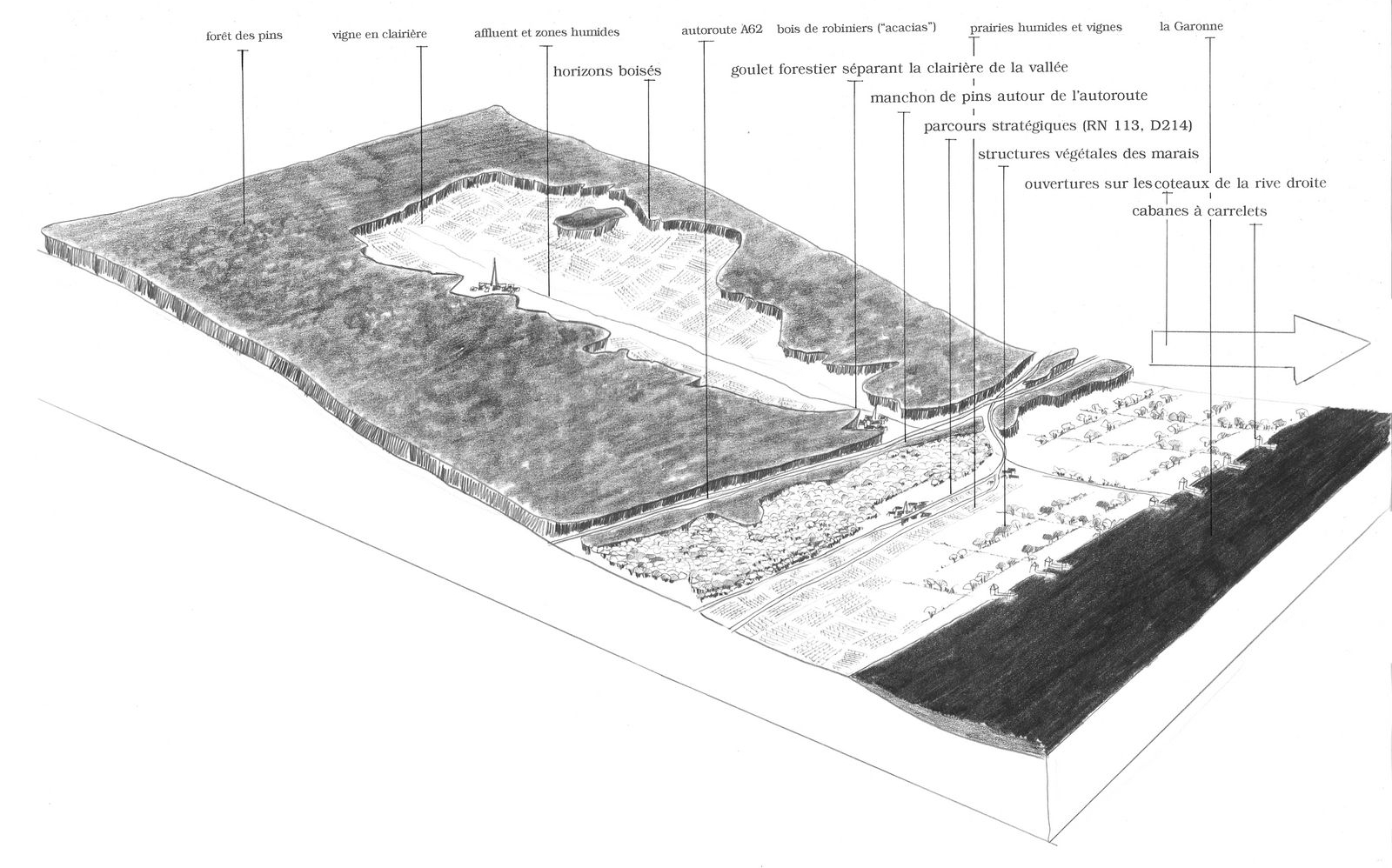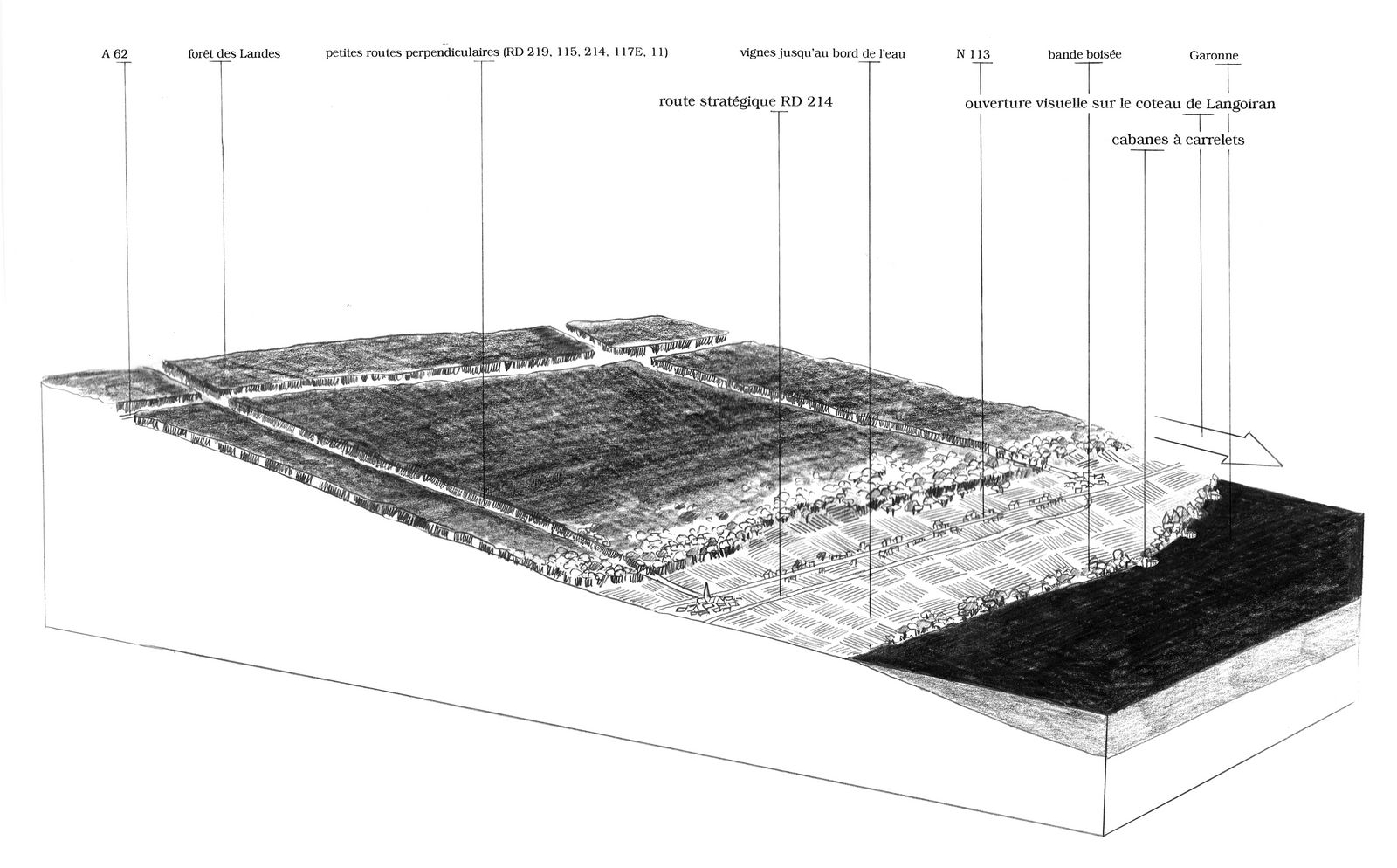 Une évolution plus récente voit d’ailleurs se multiplier les plantations de peupliers à proximité du fleuve, aggravant ce phénomène d’obstruction visuelle. Cette transformation tend à refermer les paysages et à occulter les vues sur la Garonne, rendant moins évident le lien entre le fleuve et son territoire. L’effet de ces boisements (monospécifiques et d’une même classe d’âge) en termes d’écologie et de paysage est plutôt négatif en devenant massif.