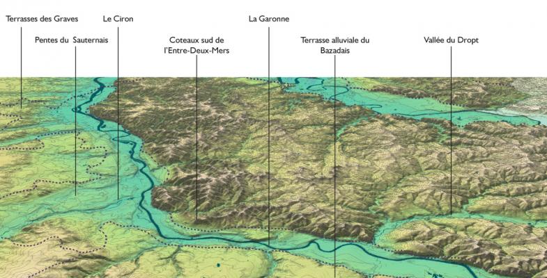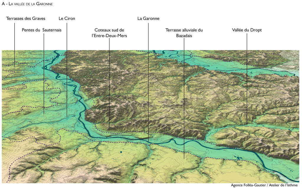 En rive droite de la Garonne s’imposent, hauts et raides, les coteaux de l’Entre-Deux-Mers, tandis qu’au sud, des terrasses alluviales s’élèvent jusqu’aux lisières du massif des landes. Entre ces deux bordures s’étend une plaine de faible ampleur, à travers laquelle le fleuve s’écoule en louvoyant. Dans cette vallée, les vignes, boisements, cultures et prairies forment des paysages variés et équilibrés, encadrés par les villages implantés au pied des coteaux. Quelques affluents génèrent sur la rive gauche des paysages en clairières, aux caractéristiques particulières mais liés physiquement à la vallée, telles les vignes du Sauternais ou les clairières des Graves.