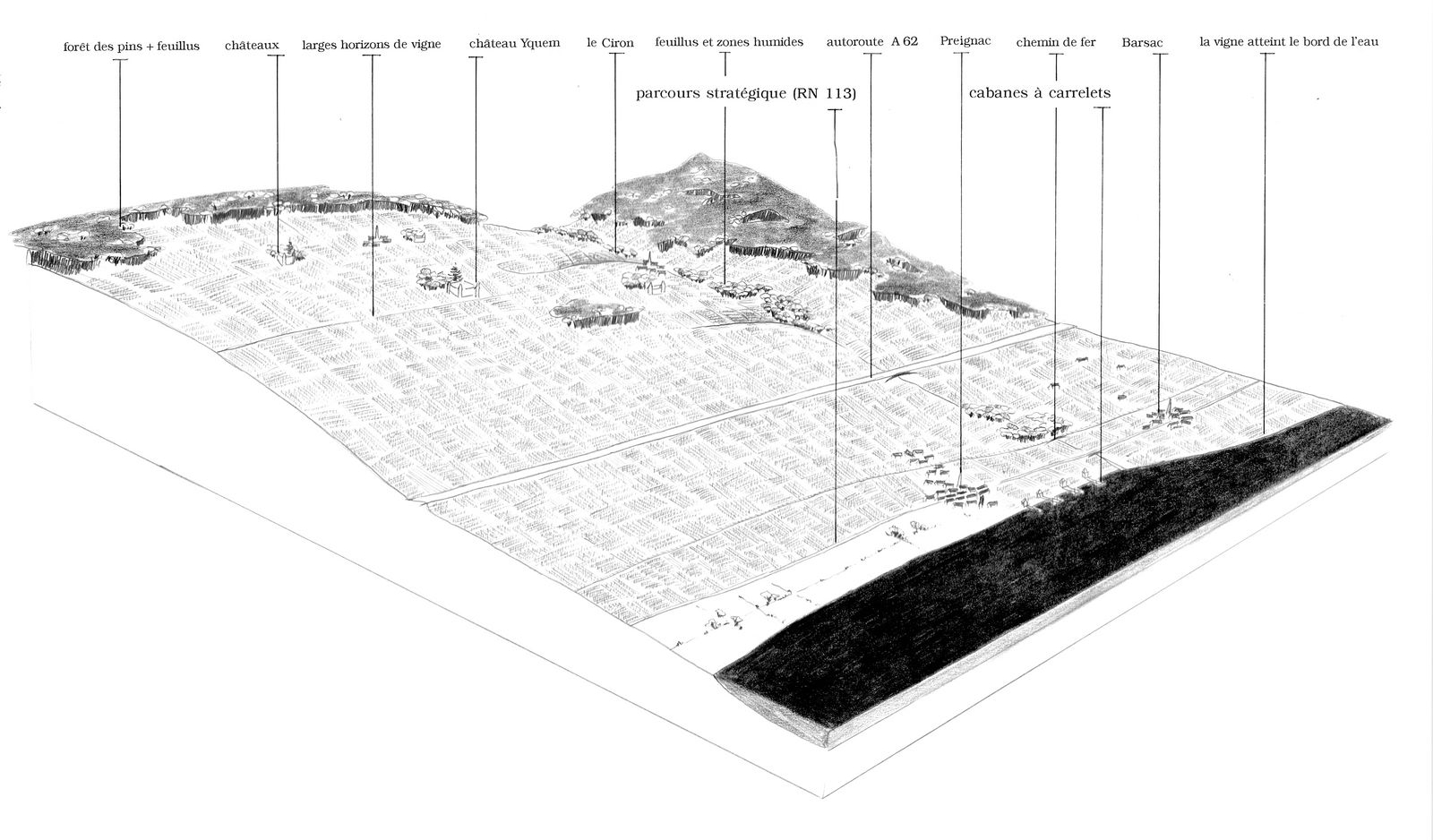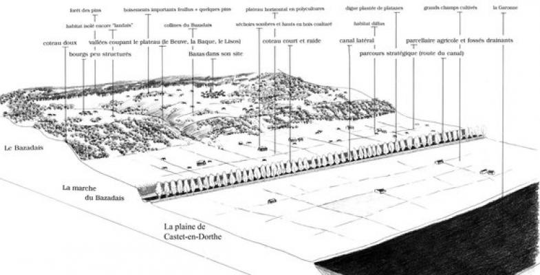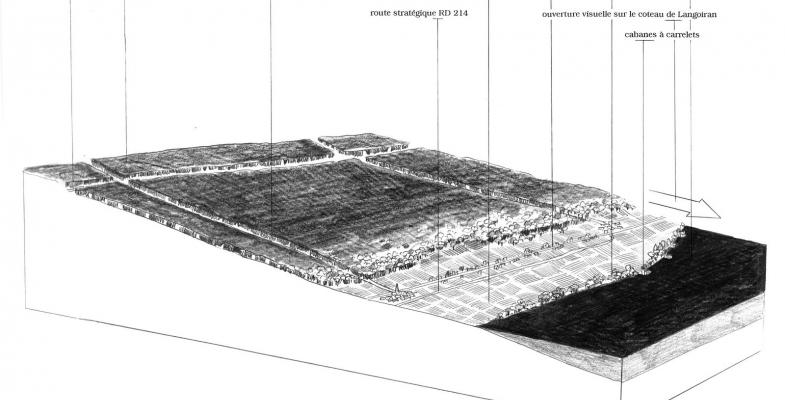 L’enfrichement des coteaux de l’Entre-Deux-Mers : maintien des vignes, développement d’autres usages en complément (pâture), gestion des boisements existants, création de cheminements, aménagement de points de vue.