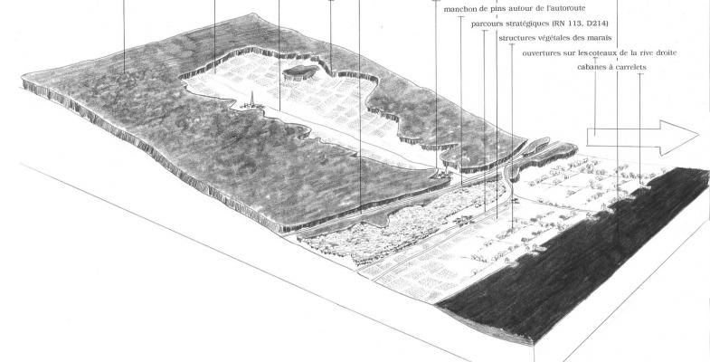 Au plus proche de l’eau, ces paysages sont également habités : la succession des cabanes à carrelets reprend une typologie qui signe la personnalité du fleuve, le "port Garonne" accueille les plaisanciers au long de ses pontons.