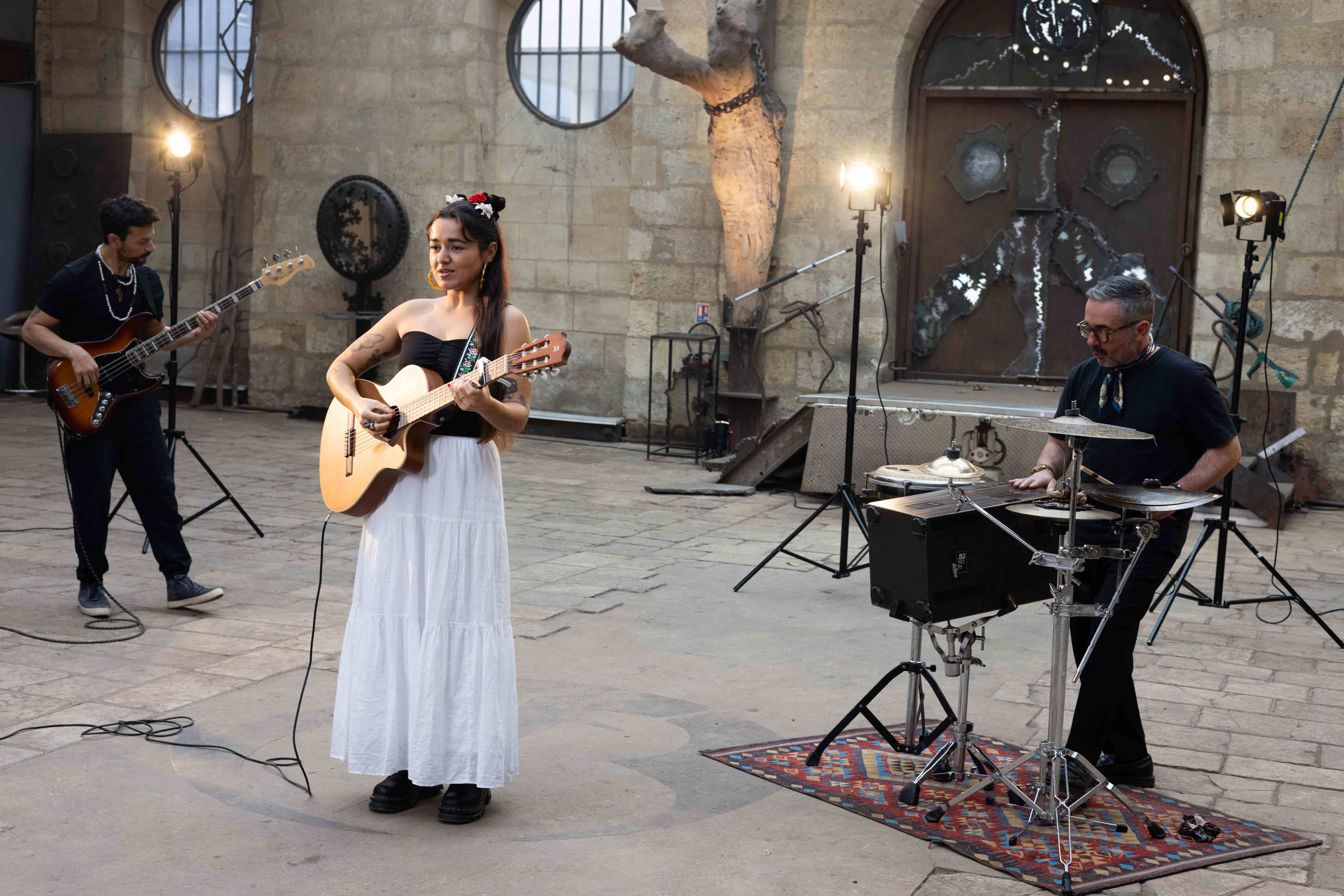 EmmaFleurs, autrice et compositrice, au chant et à la guitare, réunit dans son trio un percussionniste et un bassiste pour une traversée musicale à la fois poétique, envoûtante et solaire. Un concert original, généreux, qui provoque la joie, le mouvement et la rencontre. Un concert comme un conseil d’ami : “disfruta el viaje hoy” / “profite du voyage aujourd’hui”, pour tout public.