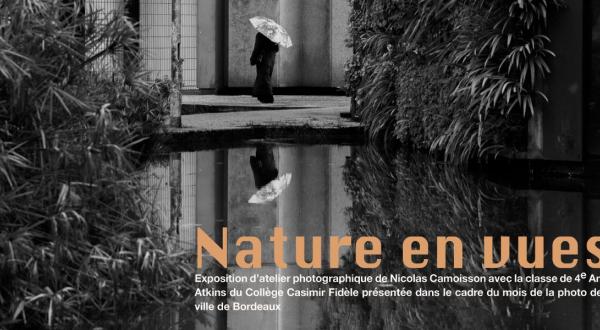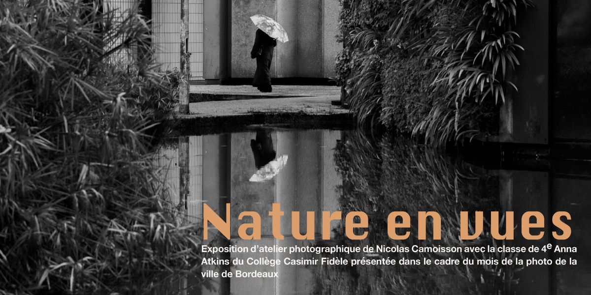 Venez découvrir « Nature en Vues », une exposition d'atelier photographique de Nicolas Camoisson avec la classe de 4e Anna Atkins du collège Casimir-Fidèle présentée dans le cadre du Mois de la photo de Bordeaux. Les photos réalisées par les élèves sont présentées à la fois à la salle des fêtes du Grand Parc et à la Maison de l'Europe jusqu'au 3 mai 2026.
