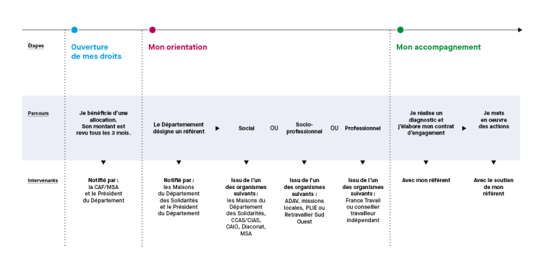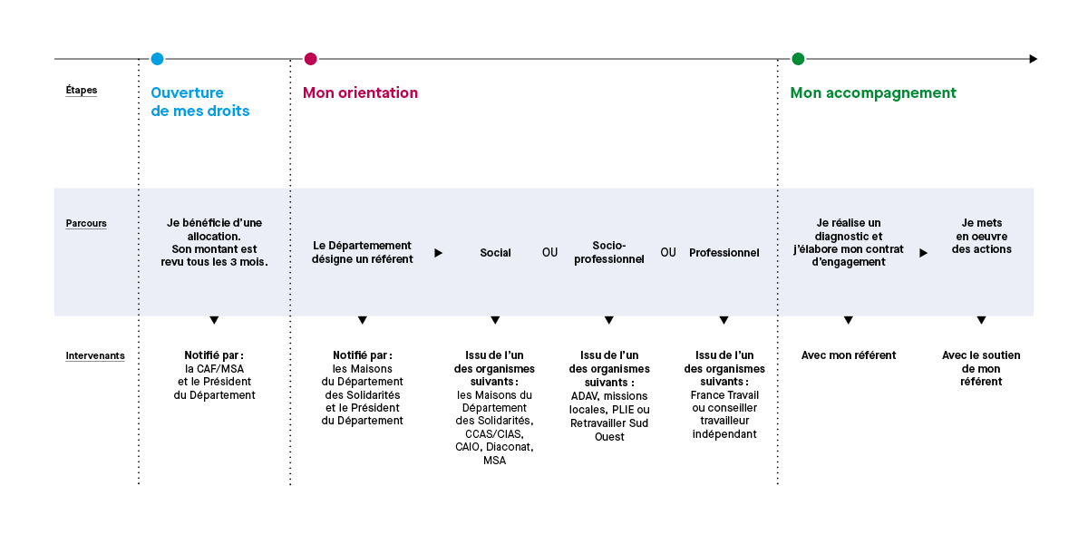 • Un intervenant social : il s'agit d'un travailleur social de la Maison du Département des Solidarités ou du CCAS dont vous dépendez, ou d’une association agréée par le Département comme le Diaconat de Bordeaux ou le CAIO (Centre d'Accueil d'Information et d'Orientation). Si vous êtes exploitants agricoles, vous serez accompagné par la MSA.