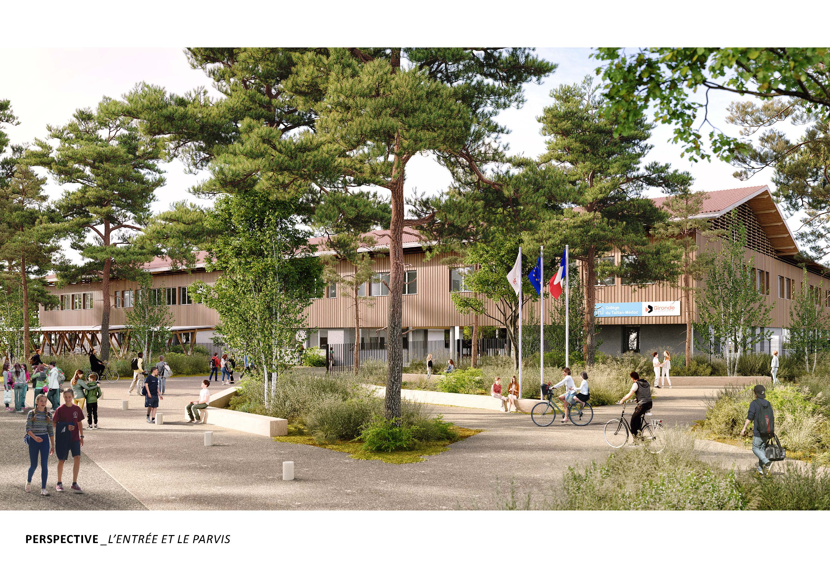 L'architecture du collège s'intègre dans le paysage des Landes girondines, avec une valorisation du bois et des espaces arborés qui sont à la fois une richesse naturelle et un marqueur de ce territoire. À la rentrée 2024, l'accueil des collégiens se fera ainsi sous une canopée perméable, abritant notamment un atrium où convergeront les voies de circulation de l’ensemble. Les toits pentus renvoient eux aussi au paysage, en évoquant ceux des fermes landaises.